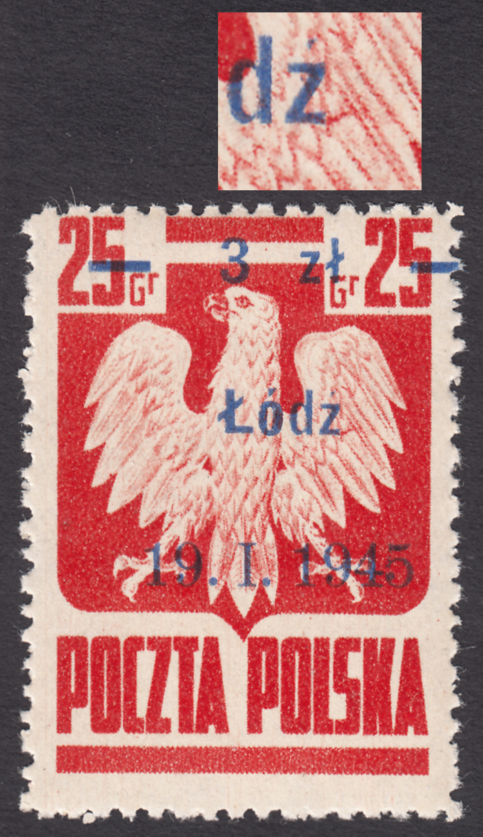 1945 "Łódź" - wyzwolenie dziesięciu miast, znaczek za 3 zł./25 gr. z lekko przesuniętym w prawo nadrukiem typu I i błędem na znaczku podstawowym z I walca poz.51 "poprzeczna kreska na 3 piórze prawego skrzydła", gwarancja z opisem walca pozycji i błędu Walocha. | Fi.351I B Mi.390VII |