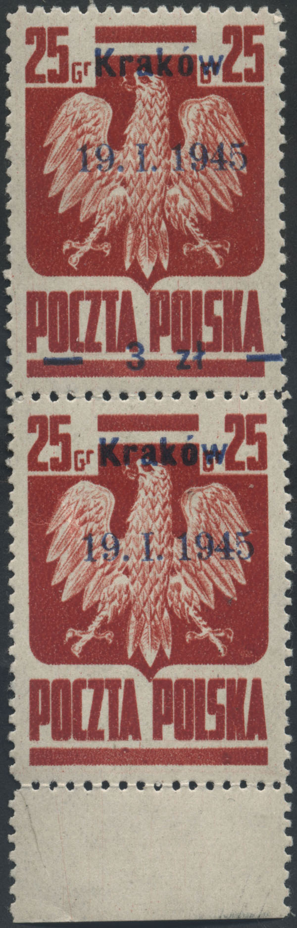 1945 wyzwolenie miast, parka znaczków z przesuniętym nadrukiem, gwarancja Walocha. | Fi.350MK Mi.390VI |