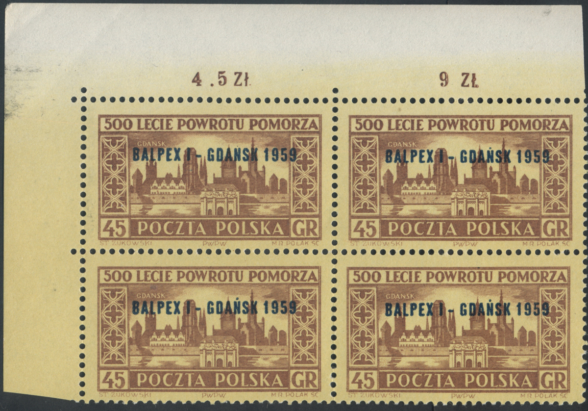 1959 wystawa filatelistyczne "Balpex I", narożny znaczek z błędem nadruku "N zamiast Ń w GDAŃSK", na górnym marginesie numer walca, gwarancja i opis Walocha. | Fi.974B1 Mi.1118I |