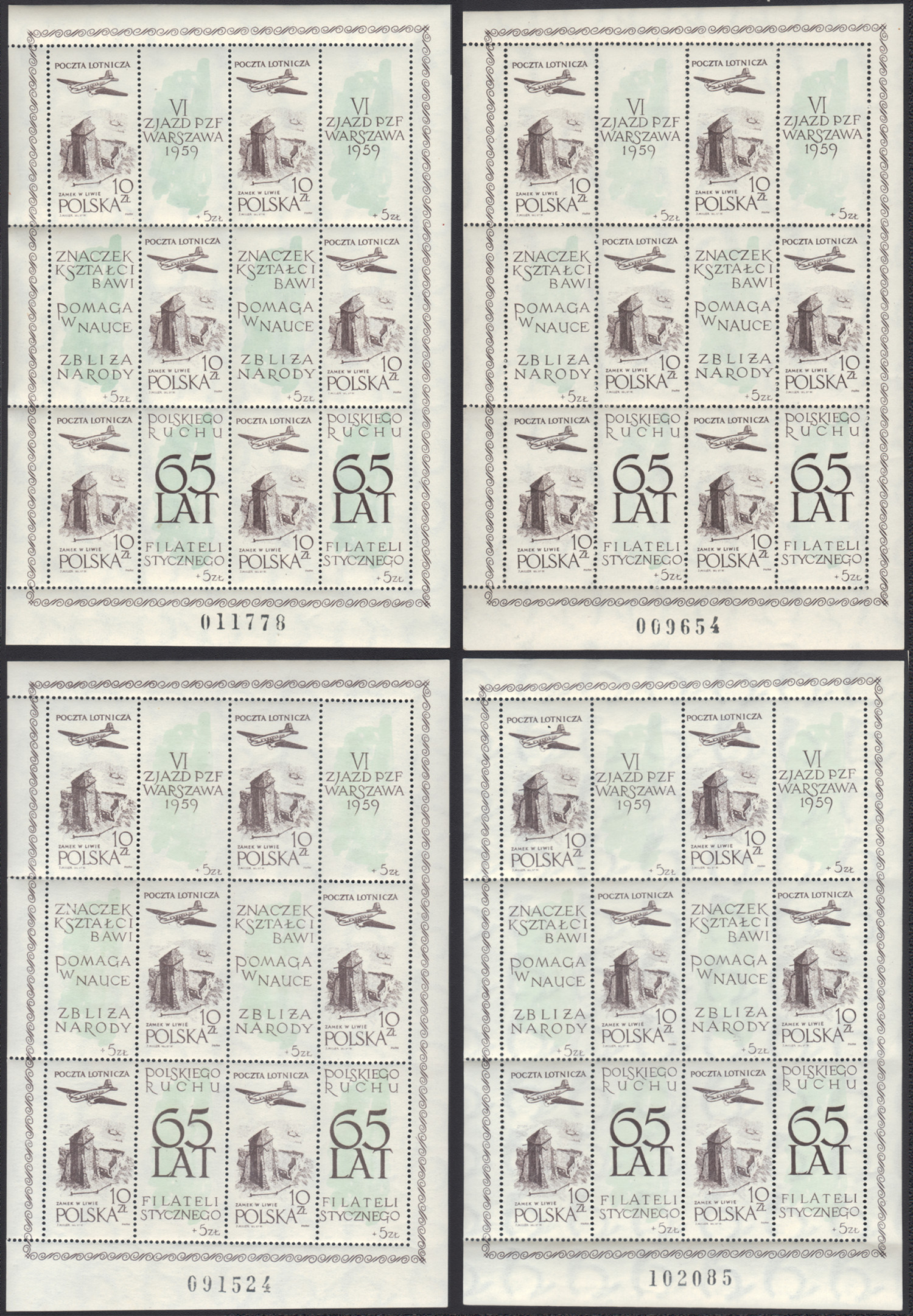 1959 65-lecie polskiego ruchu filatelistycznego, arkusik ozdobny z bardzo niskim numerem. | Fi.956I ark. Mi.1101 |