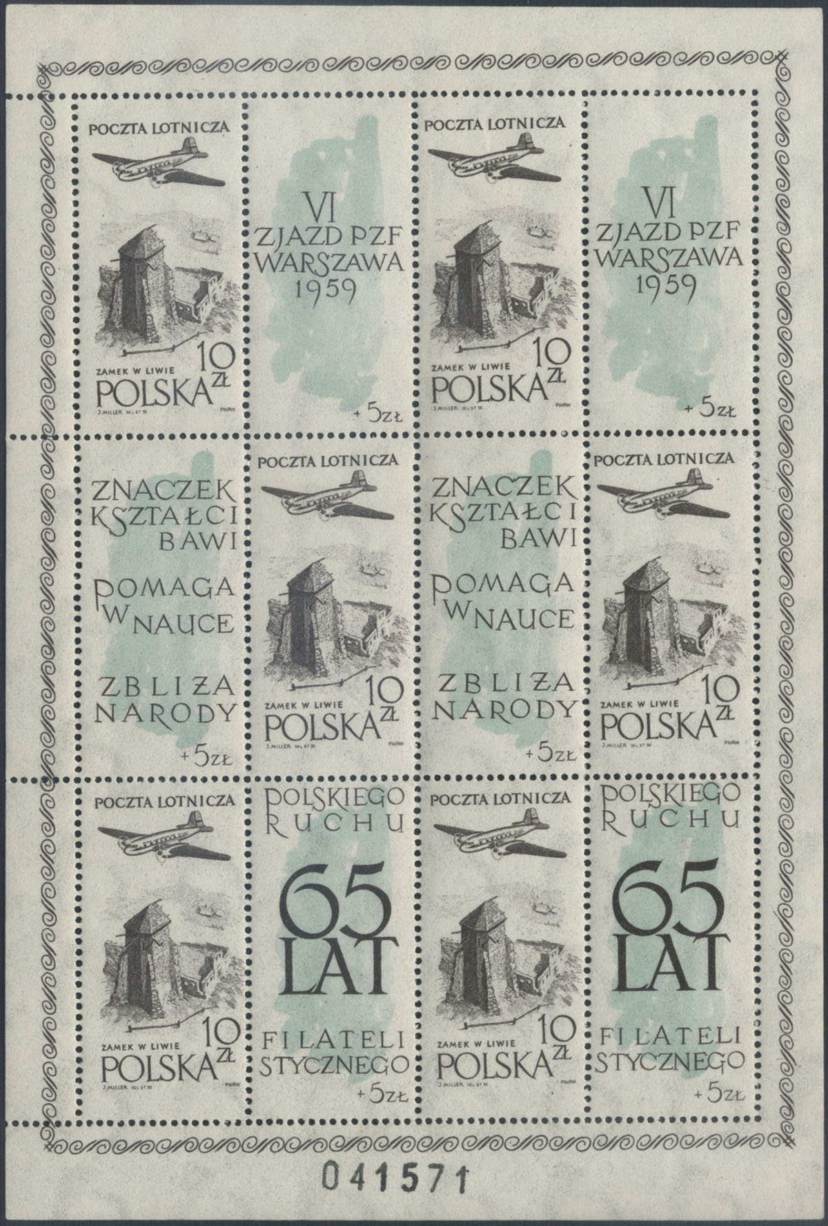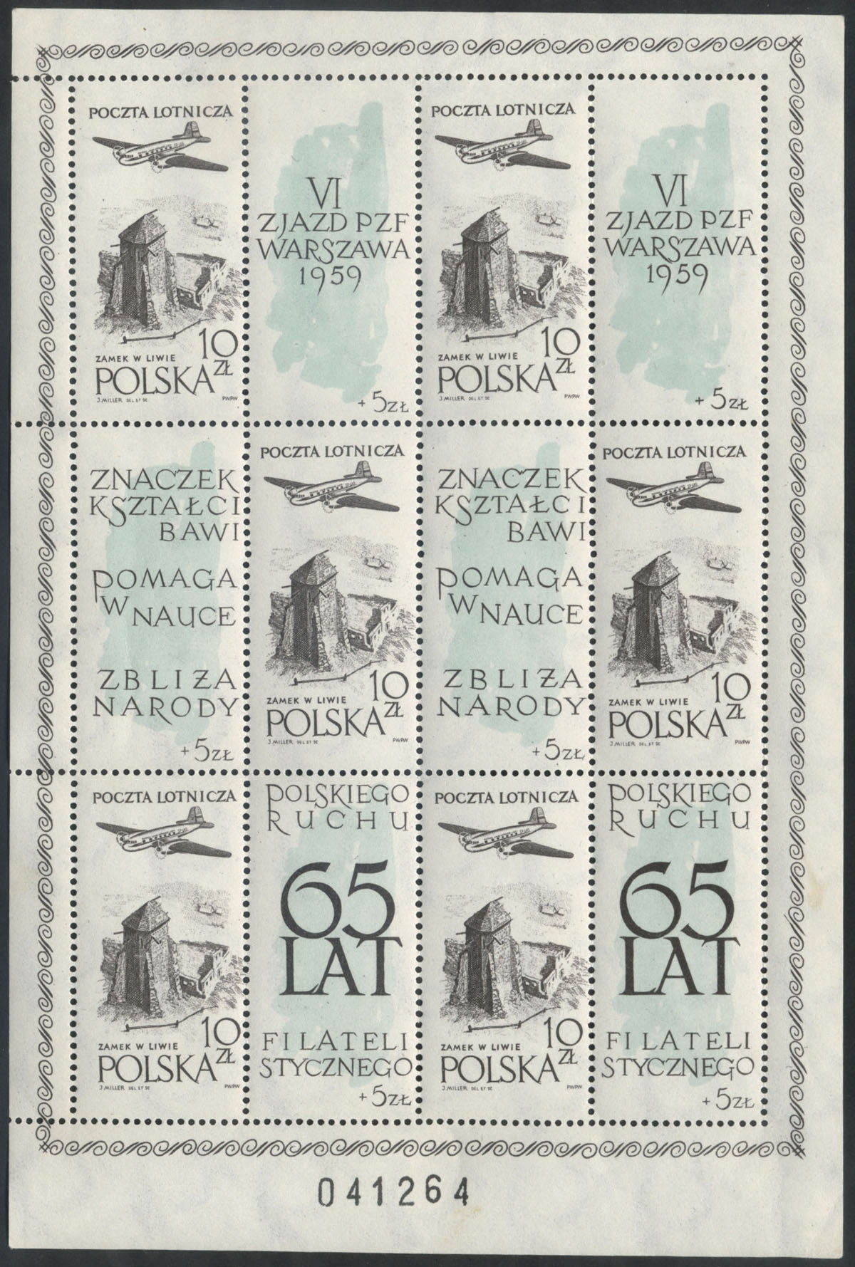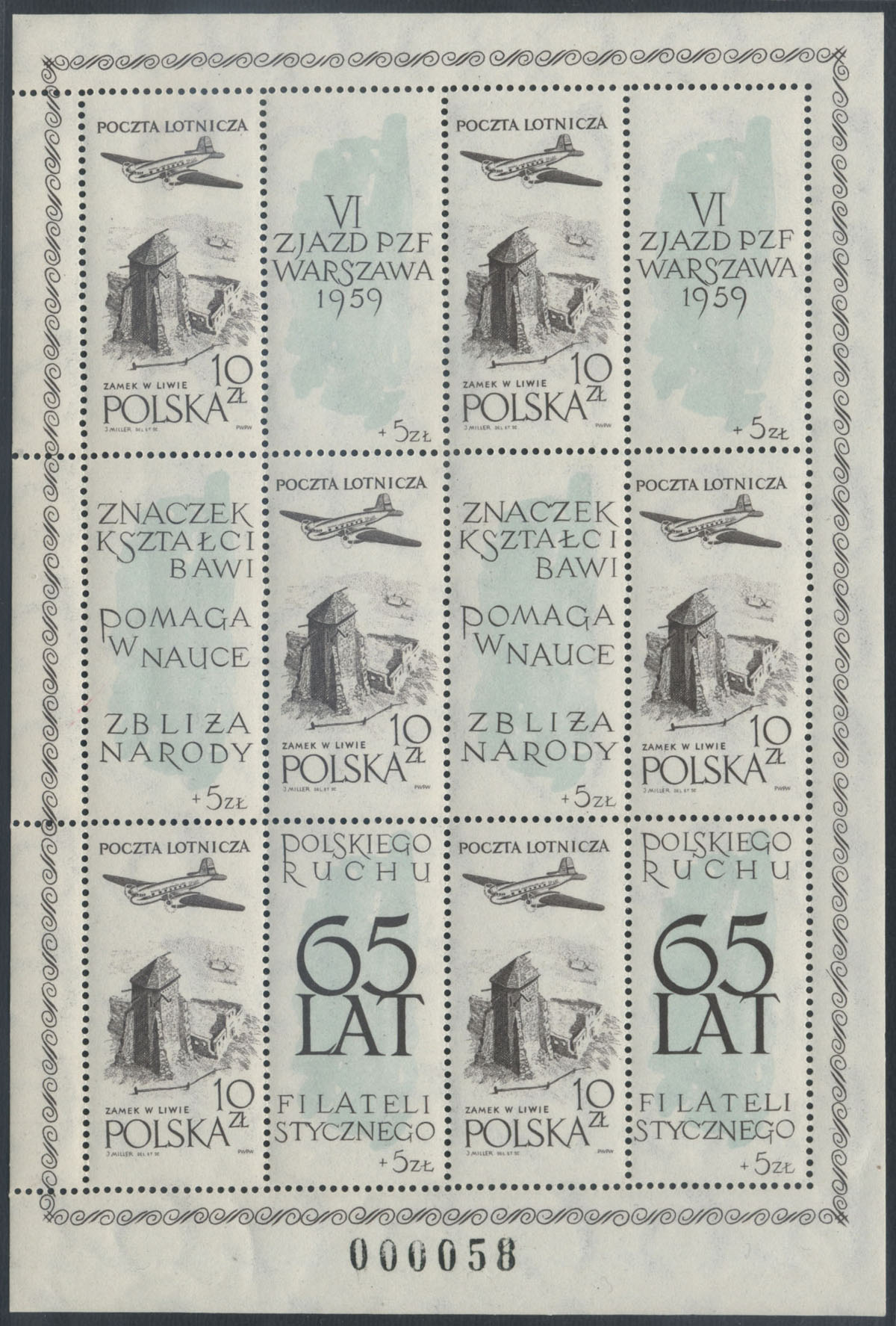1959 65-lecie polskiego ruchu filatelistycznego, arkusik ozdobny z bardzo rzadkim krojem cyfr numeratora - grotesk. | Fi.956II ark. Mi.1101 |