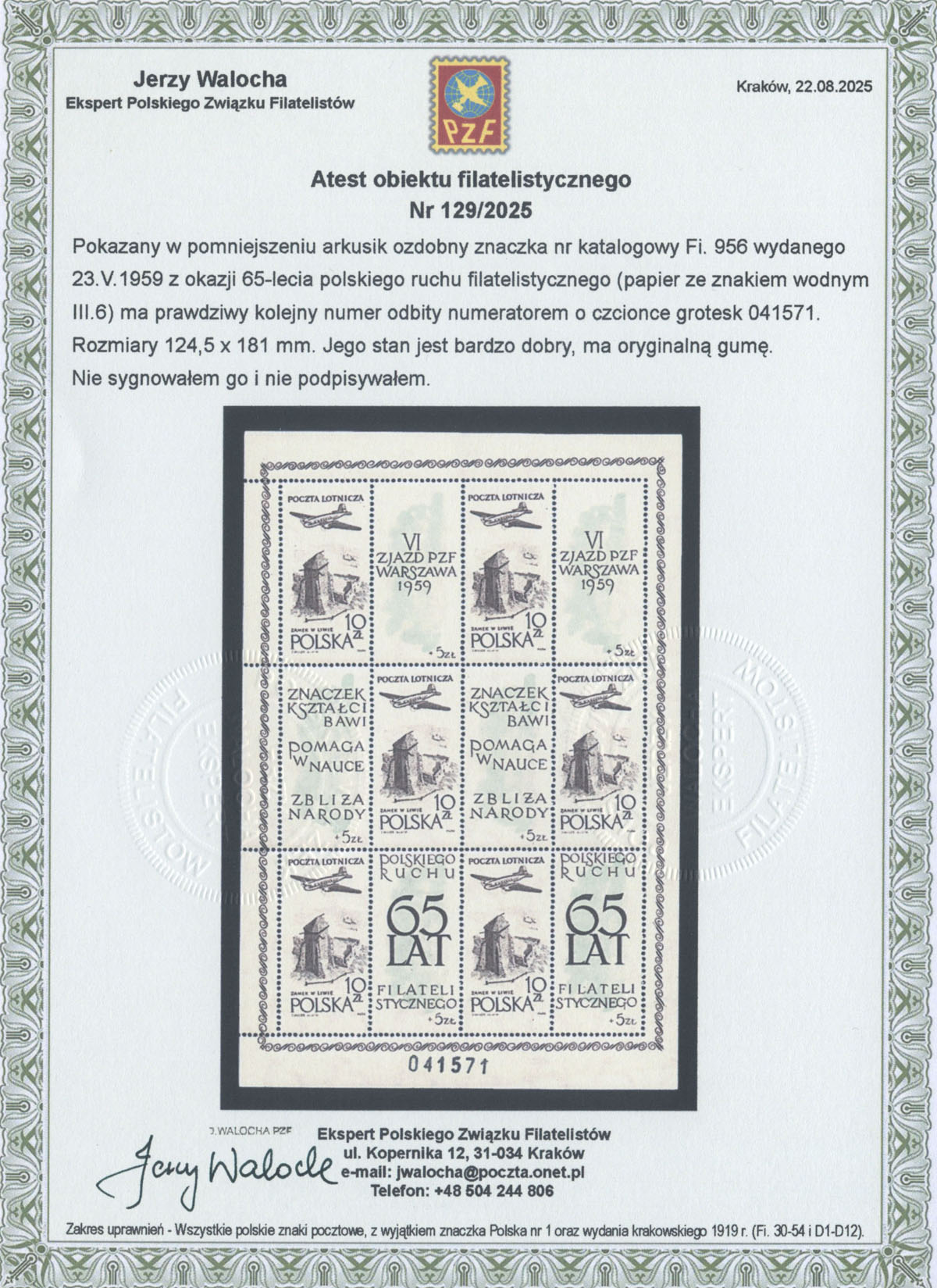1959 65-lecie polskiego ruchu filatelistycznego, arkusik ozdobny z bardzo rzadkim krojem cyfr numeratora - grotesk, fotoatest Walocha. | Fi.956II ark. Mi.1101 |