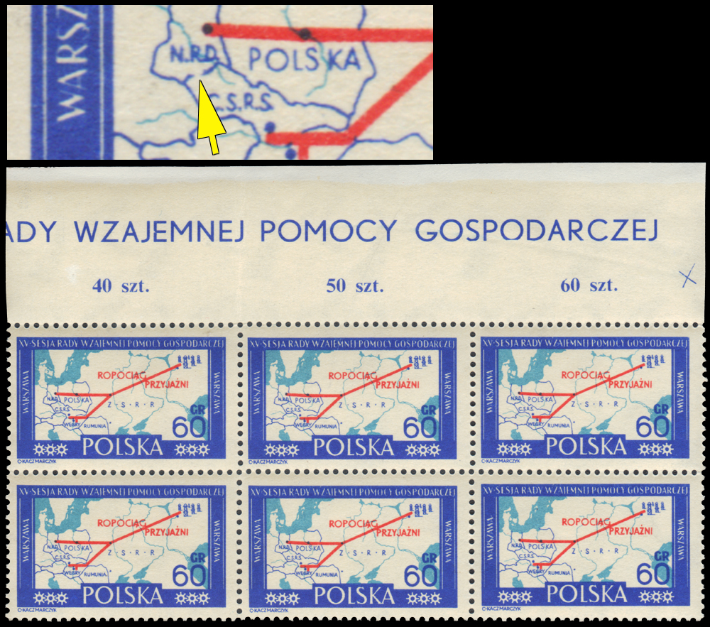 1961 XV sesja RWPG, 6-blok z górnym marginesem znaczków za 60 gr ze znakiem wodnym w położeniu - III.8, lewy dolny z błędem "przerwa w granicy między NRD i CSRS"; bardzo dobry stan zachowania; gwarancja. | Fi.1131 B1 Mi.1276 |