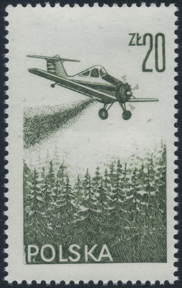 1977-83 lotnictwo współczesne, znaczek za 20 zł. typu II (bez lasu w tle), odmiana ta wykształciła się w końcowej fazie druku nowego nakładu - początkowo (w 1982) pojawiła się na kilku znaczkach w środku arkusza; sześć lat po nakładzie I także na znaczkach brzegowych; zdecydowanie niedoceniany znaczek, nie było go w abonamencie, a ze względu na inflację wzrosło zapotrzebowanie na wysokie nominały i znaczek w większości zużyto pocztowo, obok dla porównania znaczek z lasem w tle dodany gratis. | Fi.2337II Mi.2484 |