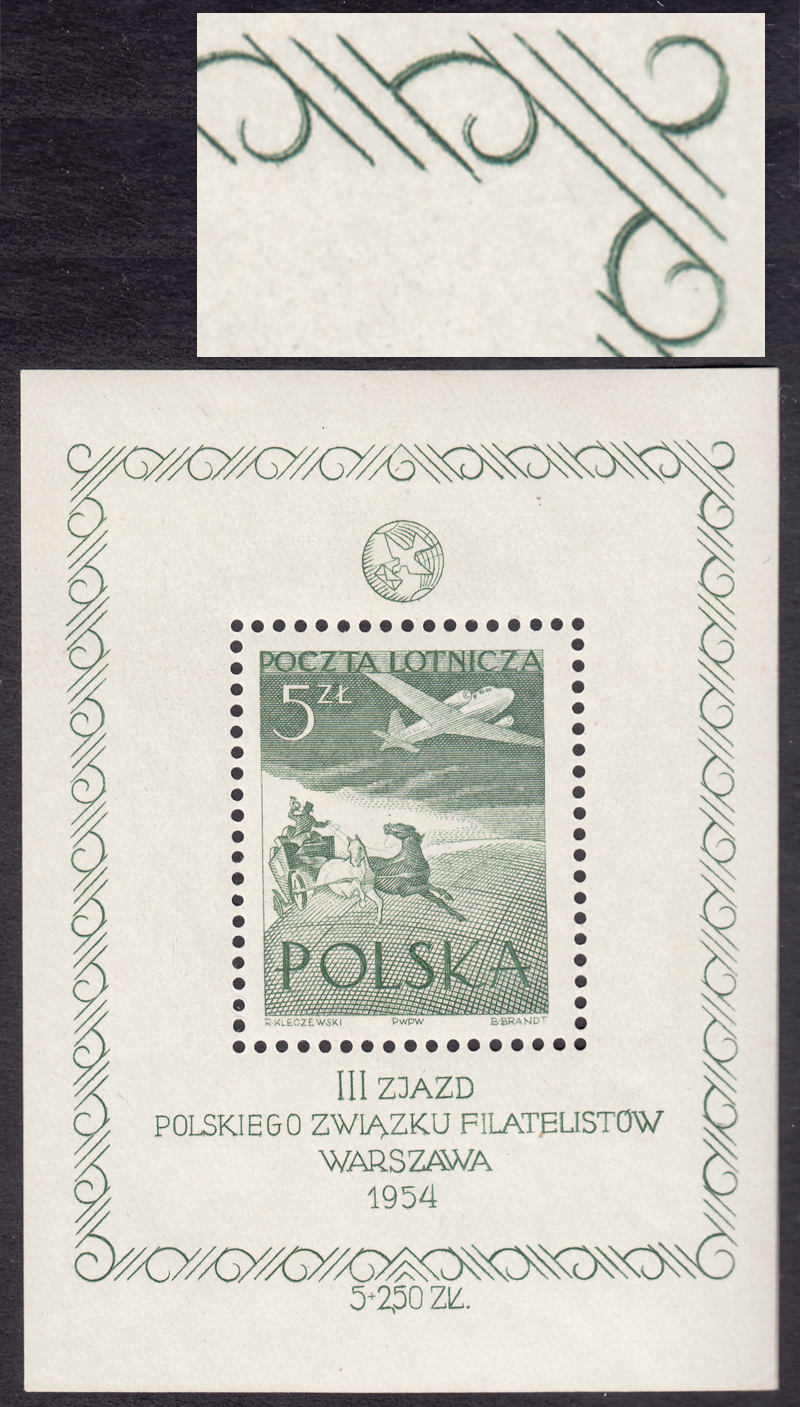 1954 zjazd Polskiego Związku Filatelistów, blok z podwójnym moletowaniem w górnym prawym rogu, gwarancja i opis Walocha. | Fi.bl.13B1 Mi.Bl.13DP |