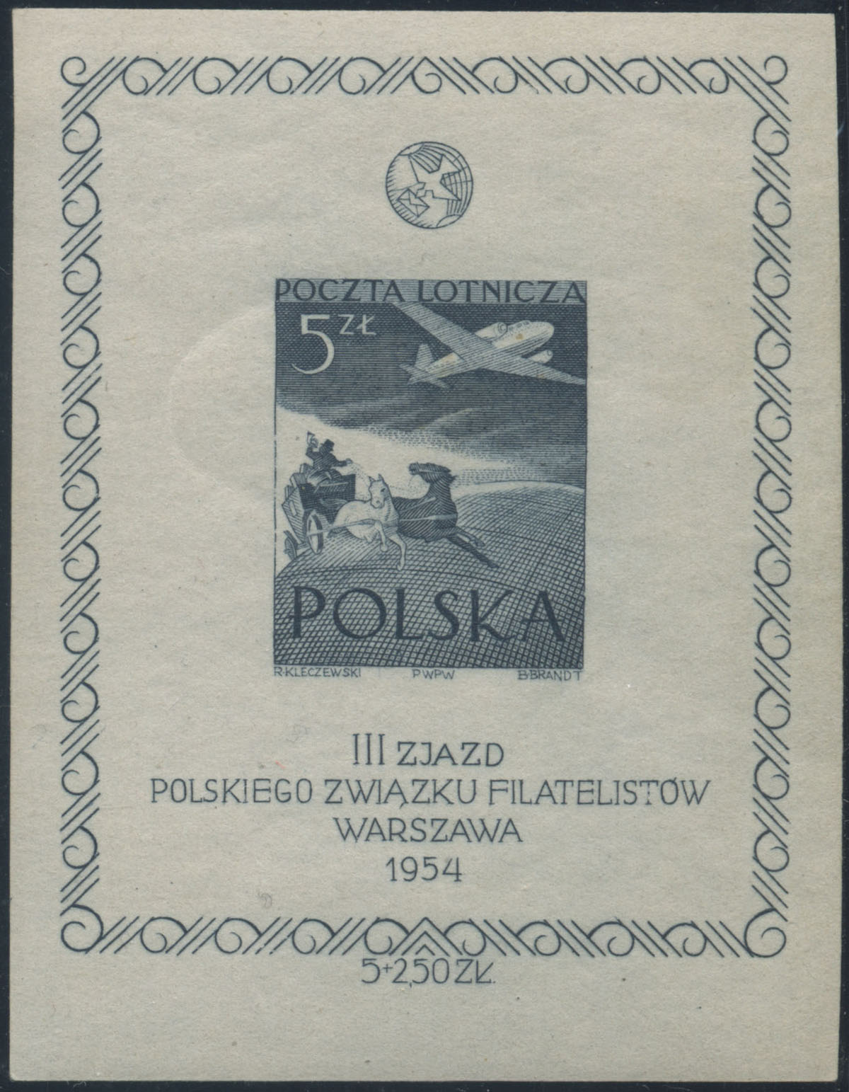 1954 III Zjazd Polskiego Związku Filatelistów, nowodruk bloku w barwie niebieskiej. | Fi.bl.13ND Mi.Bl. AI |
