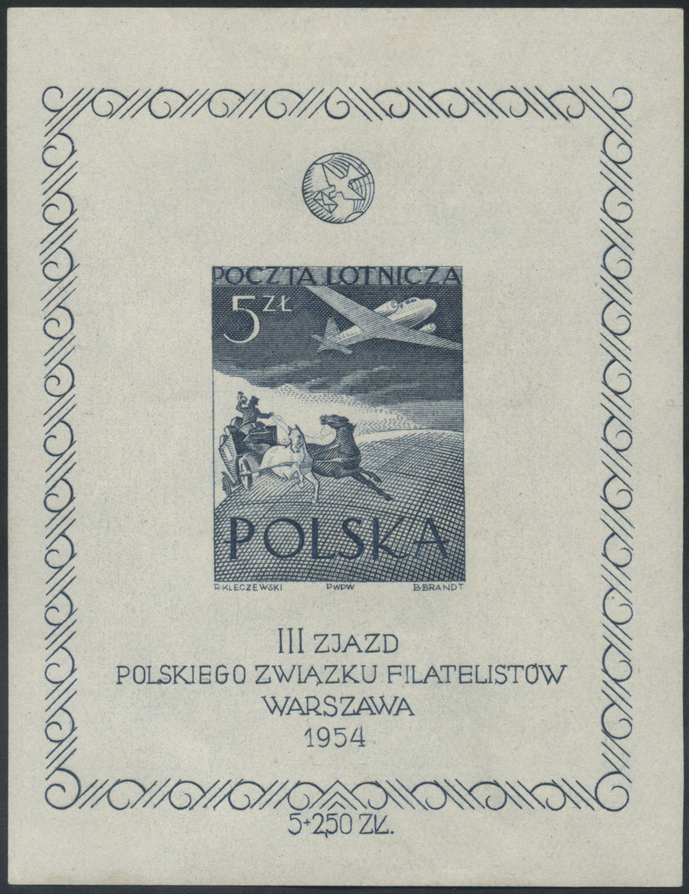 1954 III Zjazd Polskiego Związku Filatelistów, nowodruk bloku w kolorze niebieskim z podwójnym moletowaniem, gwarancja i opis Walocha. | Fi.bl.13ND B1 Mi.Bl.AI DP |