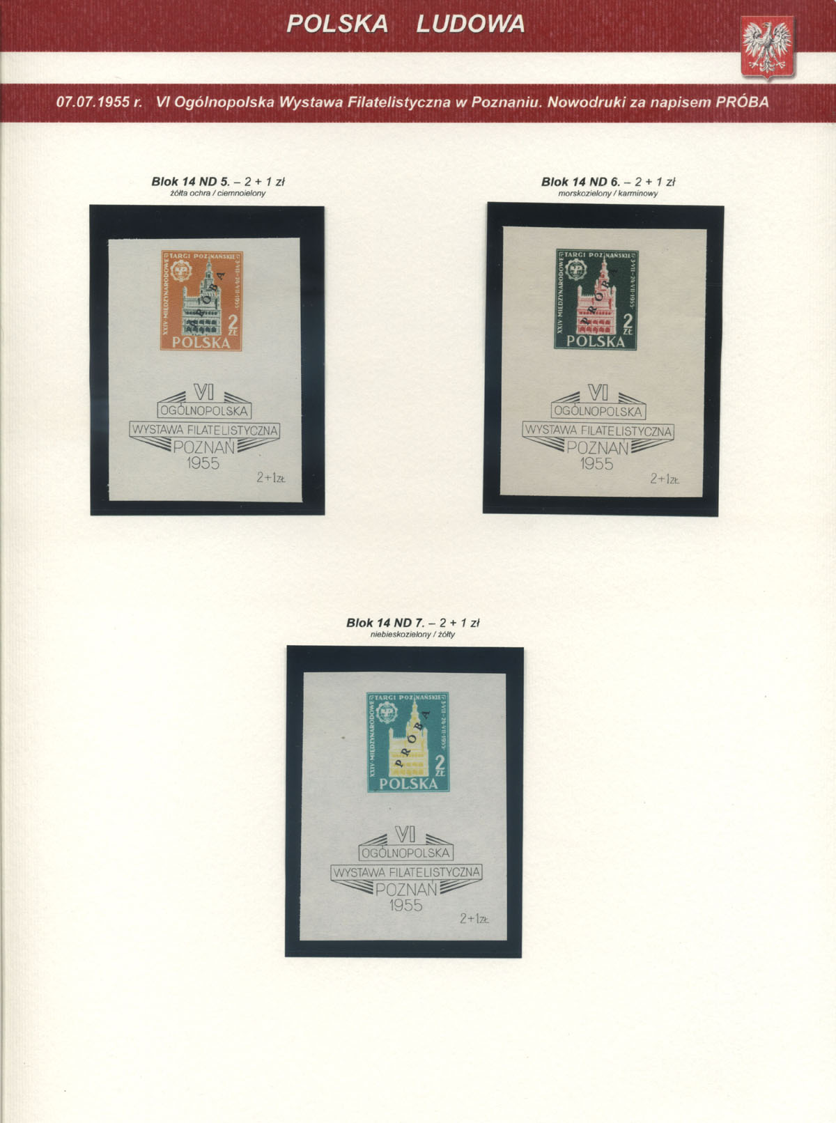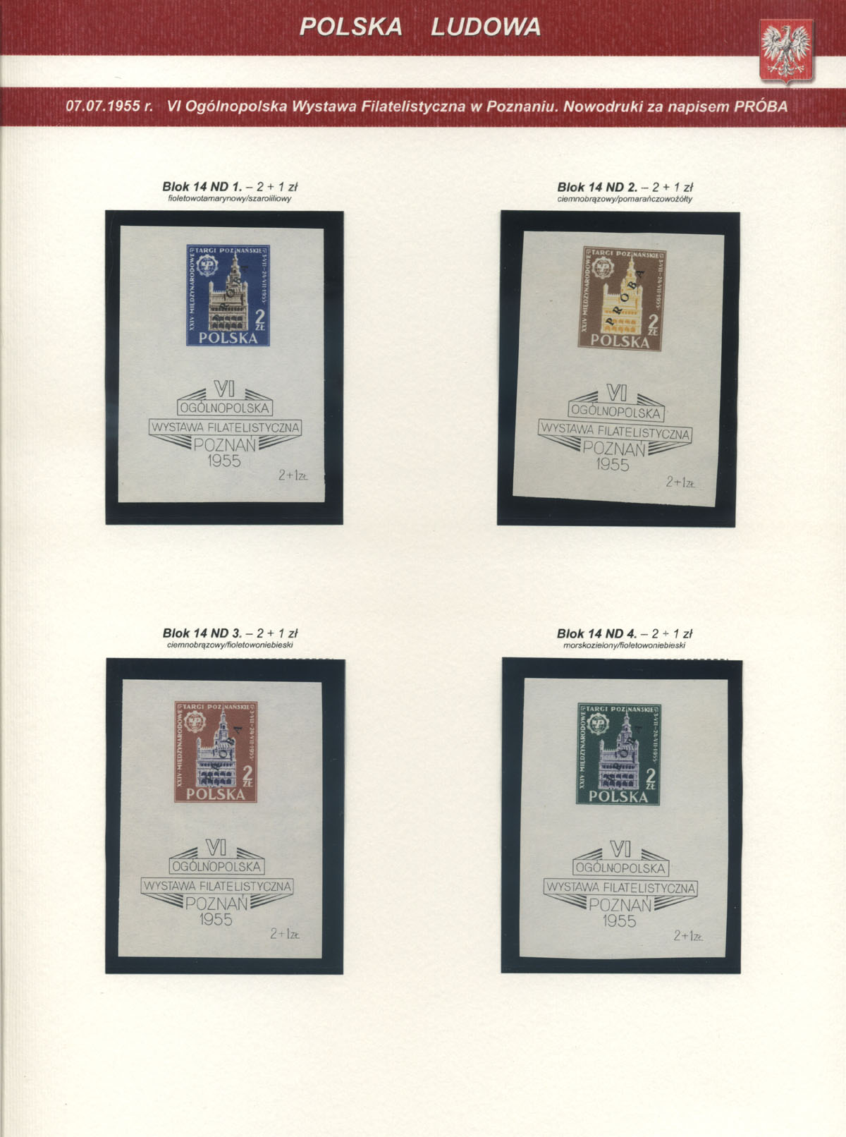 1955 komplet wszystkich znaczków ciętych wydanych z nadrukiem PRÓBA wraz z blokami na dekoracyjnych stronach albumowych, część znaczków bez gumy tak jak zostały wydane, doskonały stan - ładnie szeroko wycięte, wszystkie znaczki z gwarancją. | Fi.757-607P, bl.14P1-7 Mi.897-951P, Bl.15P |