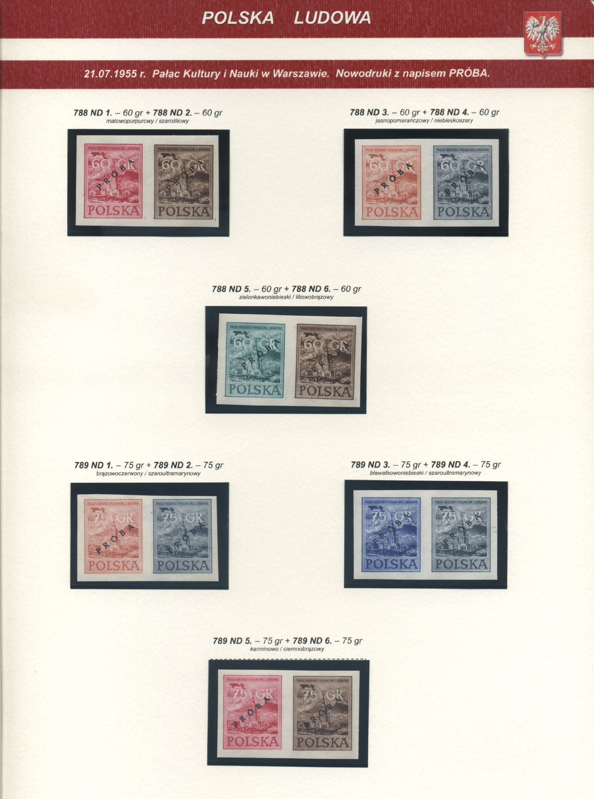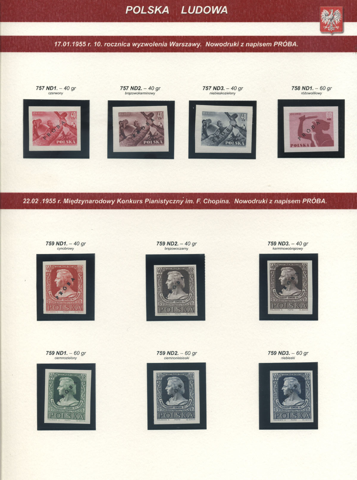 1955-56 zestaw znaczków z nadrukiem "PRÓBA", znaczki z numerami Fischera; 757-8, 761-8, 769-70, 771-2, 773-4, 790-5, 798-801, 802-3, 804-7, w sumie 87 znaczków o wartości katalogowej 6.750,- zł, wszystkie znaczki z gwarancją. | Fi.757-807P |