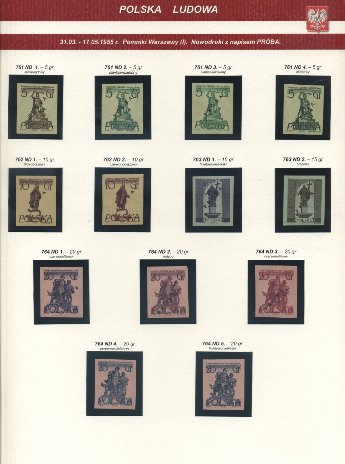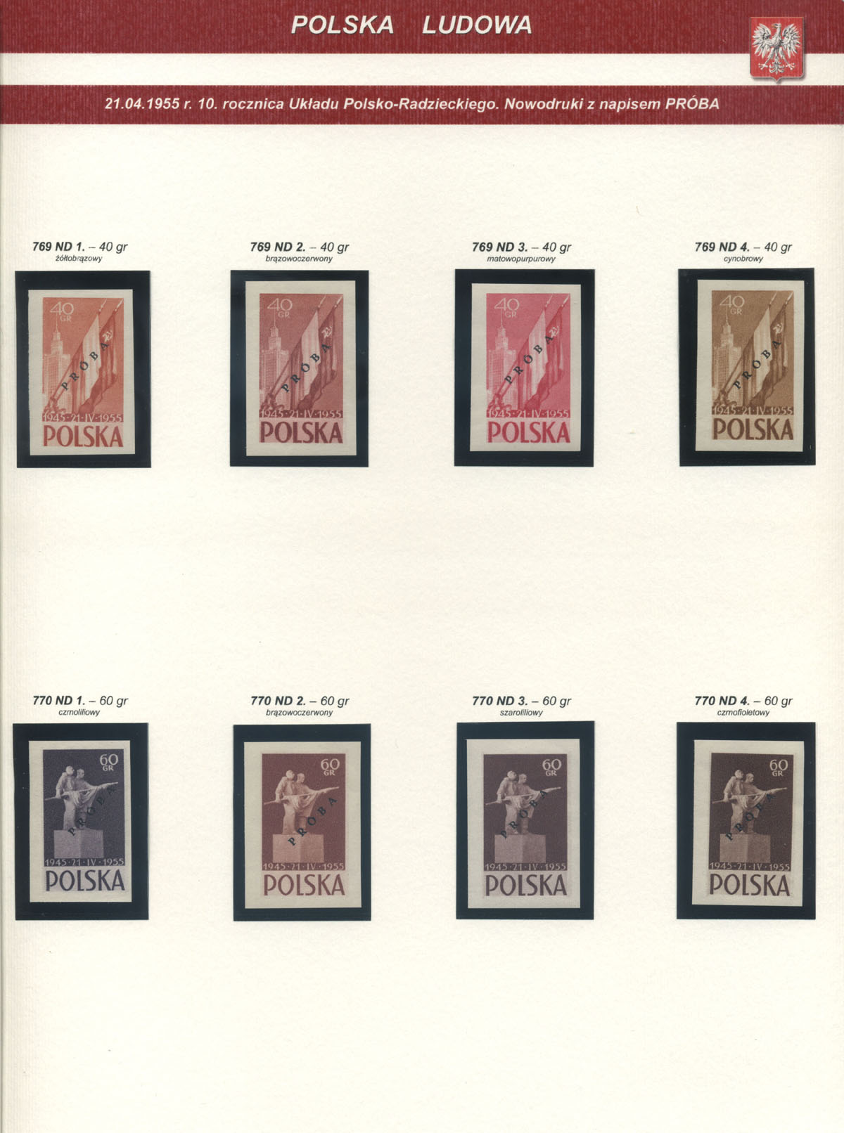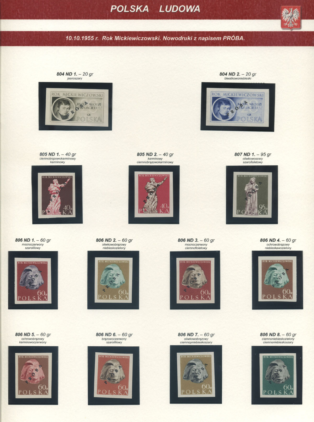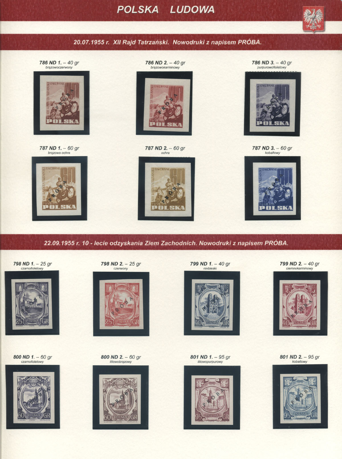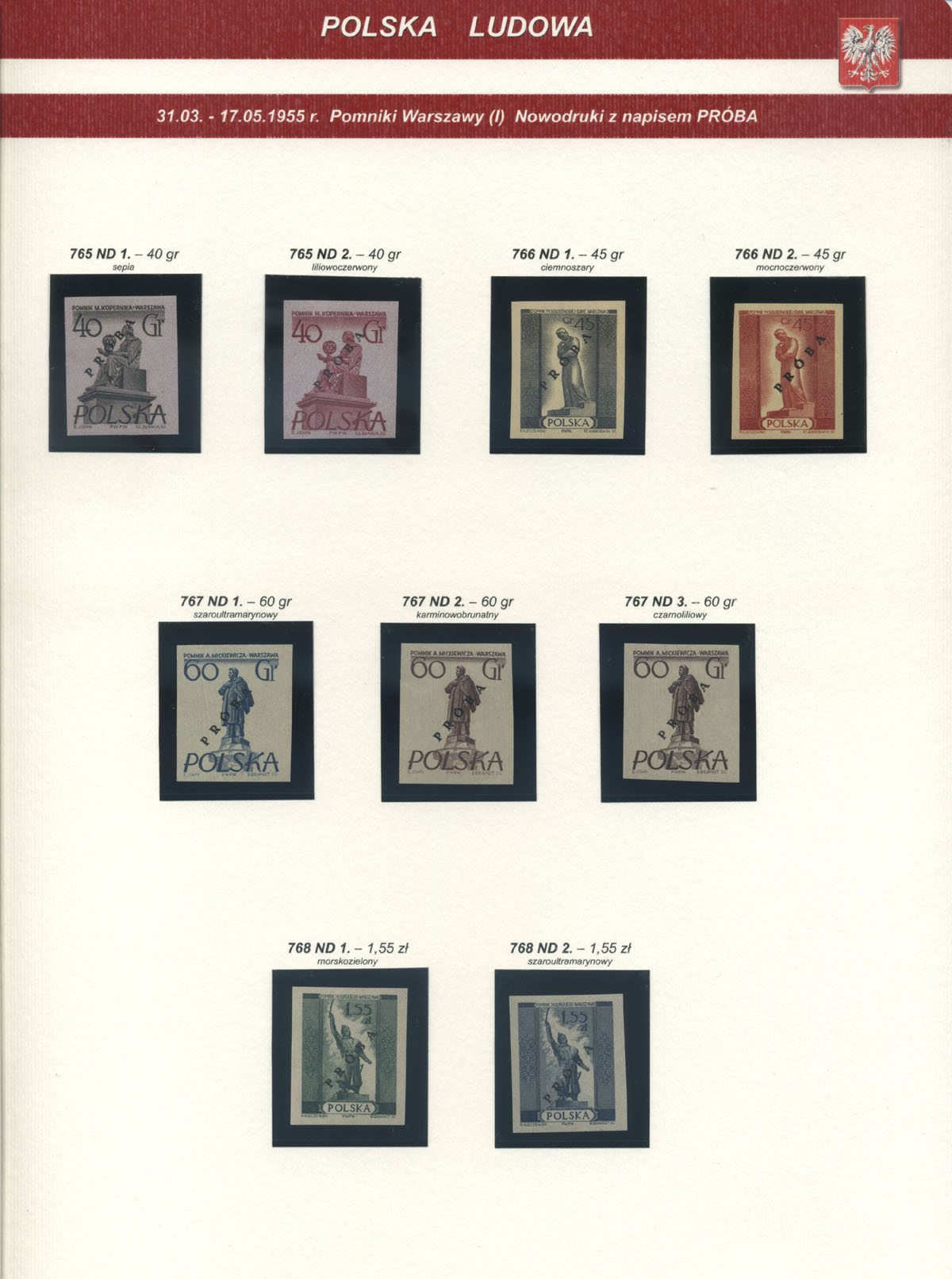 1955 KOMPLET PRÓB Z NUMERAMI WALCÓW I MIĘDZYPOLAMI; wszystkie próby, które drukowano z walca mają oznaczenie tego walca na marginesie; te gdzie oznaczenie jest dłuższe próba jest w parce, tam gdzie krótsze występuje na marginesie pod lub obok pojedynczego znaczka, dodatkowo zestaw zawiera najrzadsze i najwyżej wyceniane osiem parek prób rozdzielonych międzypolami wydania 769-70 (Fi.po 1200.- czyli w sumie 9600.-); katalogowany komplet 118 sztuk (Fi.12650.-) plus 47 sztuk jako dodatkowe w parkach (Fi.3520.-), na marginesach 102 sztuk w zestawie znajduje się numer walca, który wyceniamy na 100.- (102 x 100=10200); w sumie wycena zestawu to 35970.-; próby drukowano w ilościach po 11 arkuszy, ale kompletnych zestawów z numerem walca zachowało się jedynie kilka; nawet pojedyncze egzemplarze z oznaczeniem walca są sprzedawane z 50-250% dopłatą, tu cena wywoławcza niższa o ponad 20% od wyceny; dziś taki zestaw nie jest możliwy do zebrania. | Fi.757-807 P Mi.897-953 |