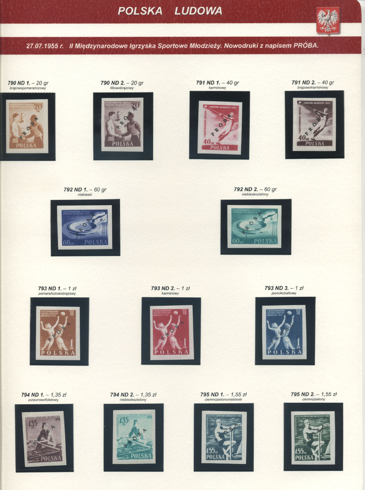 1955 komplet wszystkich znaczków ciętych wydanych z nadrukiem PRÓBA wraz z blokami w okolicznościowym klaserze Ministerstwa Łączności, część znaczków bez gumy tak jak zostały wydane, doskonały stan - ładnie szeroko wycięte, komplety rzadko oferowane i poszukiwane, katalog Fischer wartość 12.500,- zł. | Fi.757-607P, bl.14P1-7 Mi.897-951P, Bl.15P |