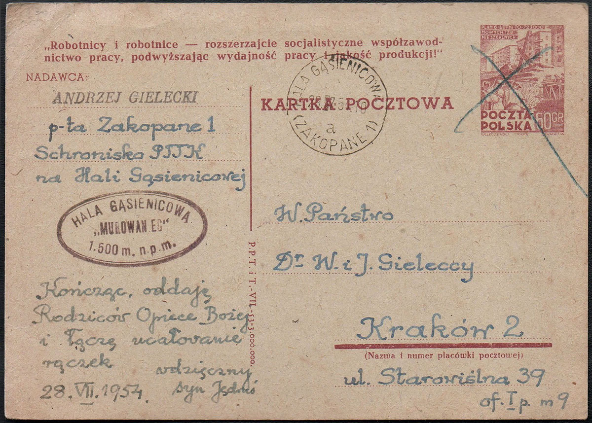 1954 pośrednictwo pocztowe w schronisku „Murowaniec” na hali Gąsiennicowej, kartka z schroniska do Krakowa, datownik pośrednictwa i stempel schroniska. | Fi.Cp136 |