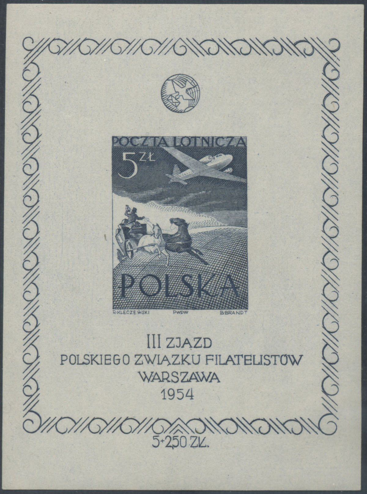 1954 III Zjazd PZF, blok lotniczy "niebieski" z podwójnym moletowaniem (Fi.1350.-), gwarancja i opis Schmutz. | Fi.bl.13 ND B1 Mi.Bl.13AI DP |