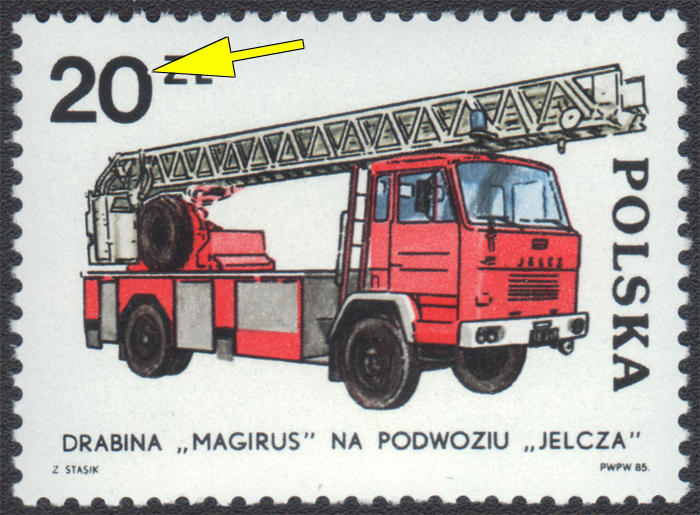 1984 Rozwój pojazdów pożarniczych, znaczek za 20 zł z błędem na poz.12 "wcięcie na zewnątrz 0 w 20"; bardzo dobry stan zachowania; gwarancja. | Fi.2817 B3 Mi.2965 |