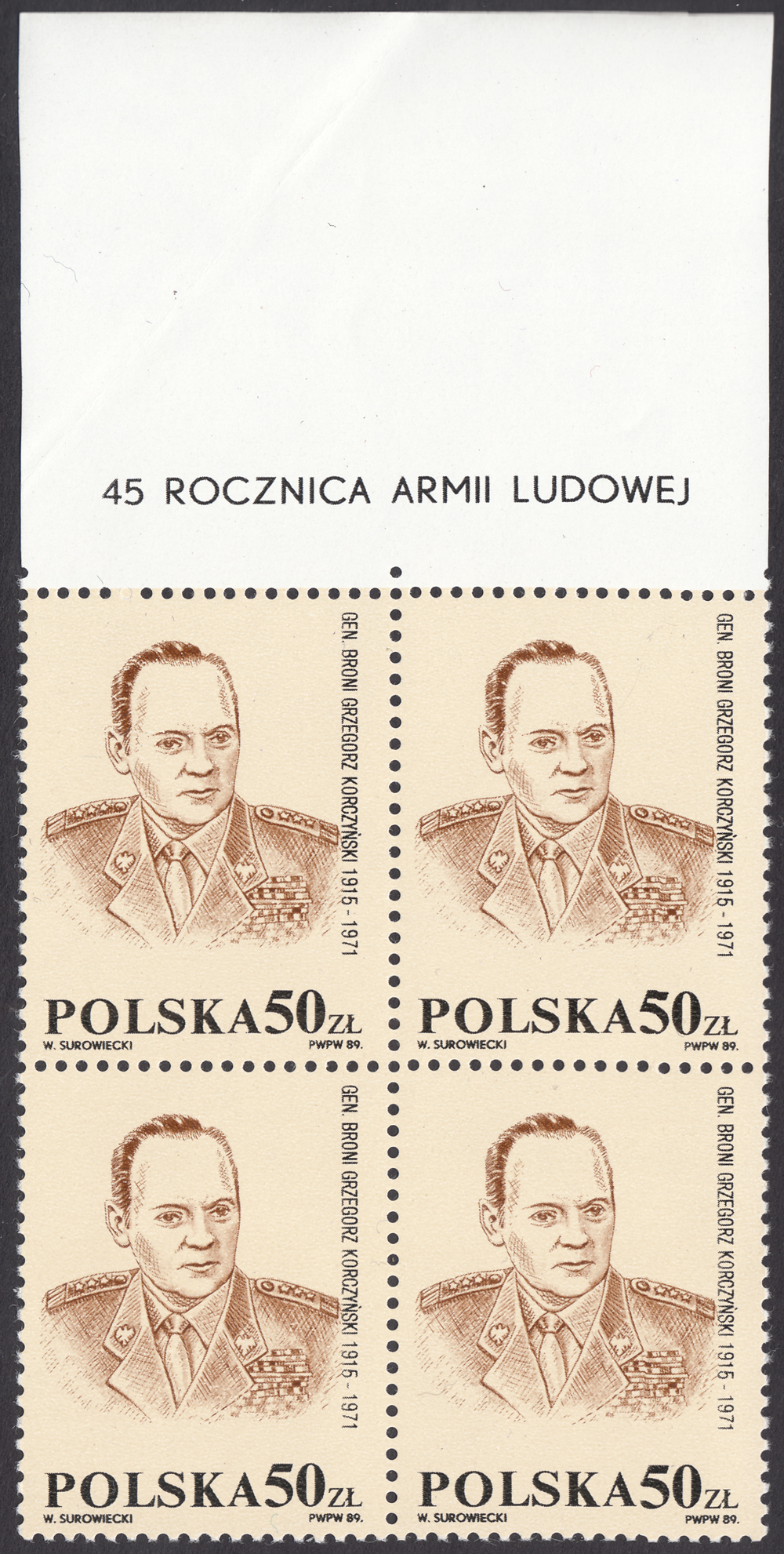 1989 Gen. G.Korczyński, znaczek niewprowadzony do obiegu, czworoblok znaczków za 50 zł., poszukiwany z tytułem wydania "45 ROCZNICA ARMII LUDOWEJ" na górnym marginesie; bardzo dobry stan zachowania. | Fi.XXVIII Mi.VI |