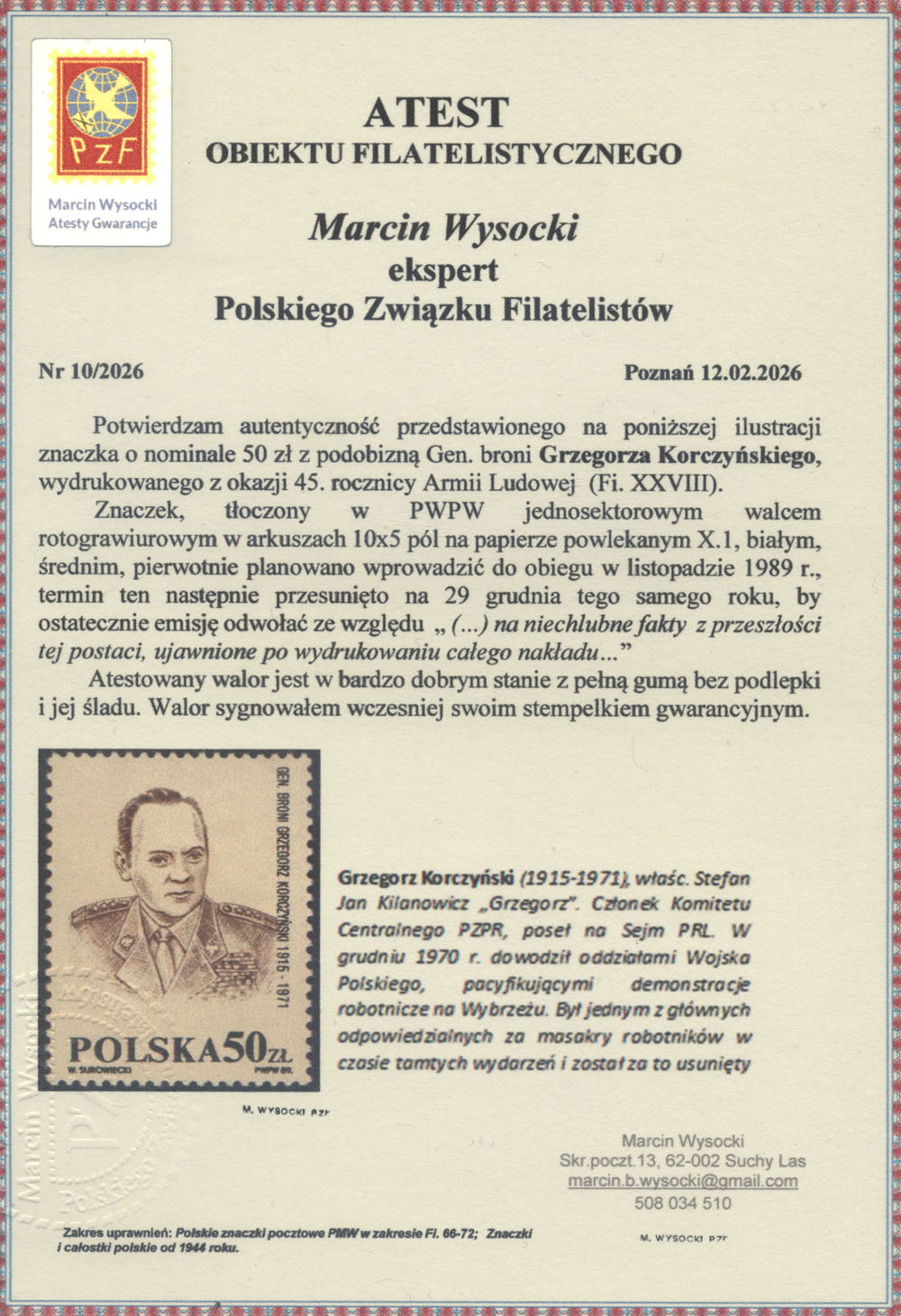 1989 gen. G. Korczyński, znaczek niewprowadzony do obiegu, fotoatest Wysocki. | Fi.XXVIII Mi.VI |