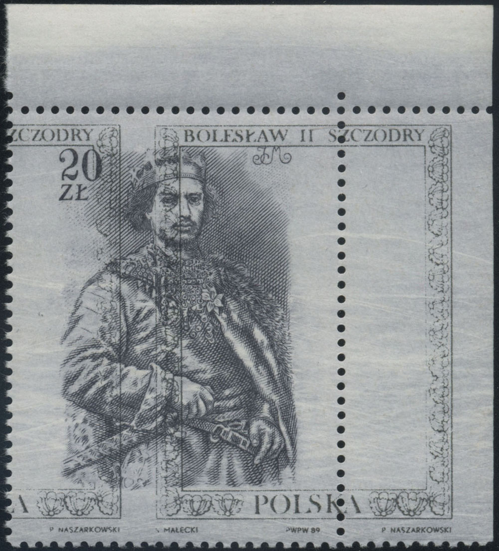 1989 poczet królów i książąt polskich, znaczek makulaturowy z silnie przesuniętym drukiem tła, gwarancja Wiatrowski. | Fi.3079MK Mi.3227 |