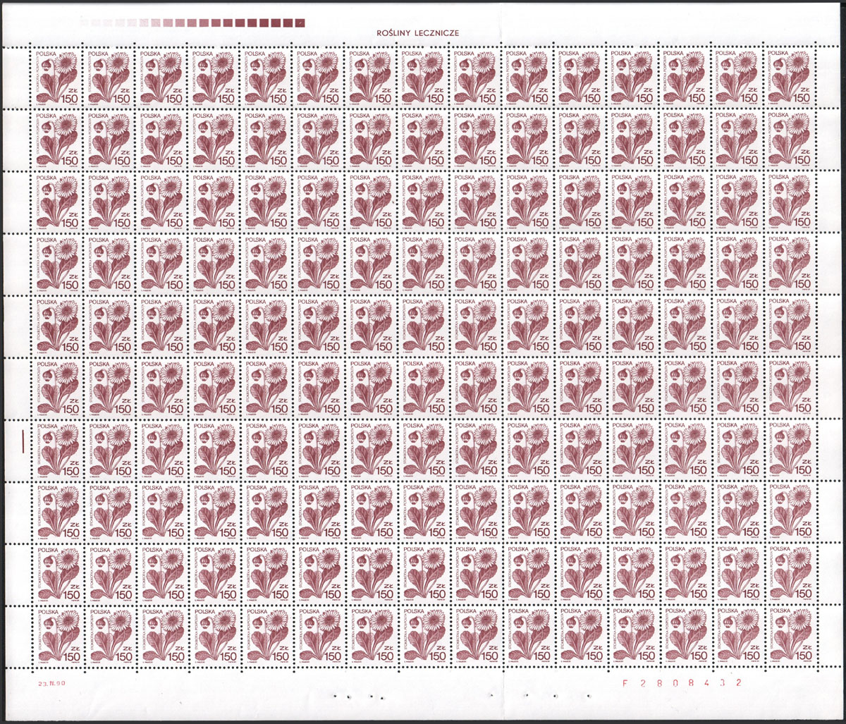 1989 Kwiaty w malarstwie polskim, seria znaczków w arkuszach drukowanych w NRD, na dolnym marginesie oznaczenia drukarni "VEB Wertpapierdruckerei der DDR"; czyste, bardzo dobry stan zachowania. | Fi.3089-96 Mi.3237-44 |