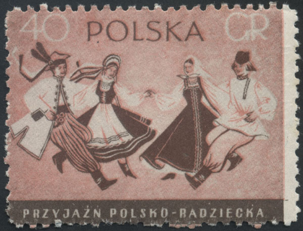 1956 miesiąc przyjaźni polsko - radzieckiej, znaczek z przesunięciem ząbkowania poziomego do góry (zmiana rysunku znaczka - pojawia się biały kolor u góry znaczka - znaczek z pierwszego rzędu). | Fi.833MK Mi.977 |