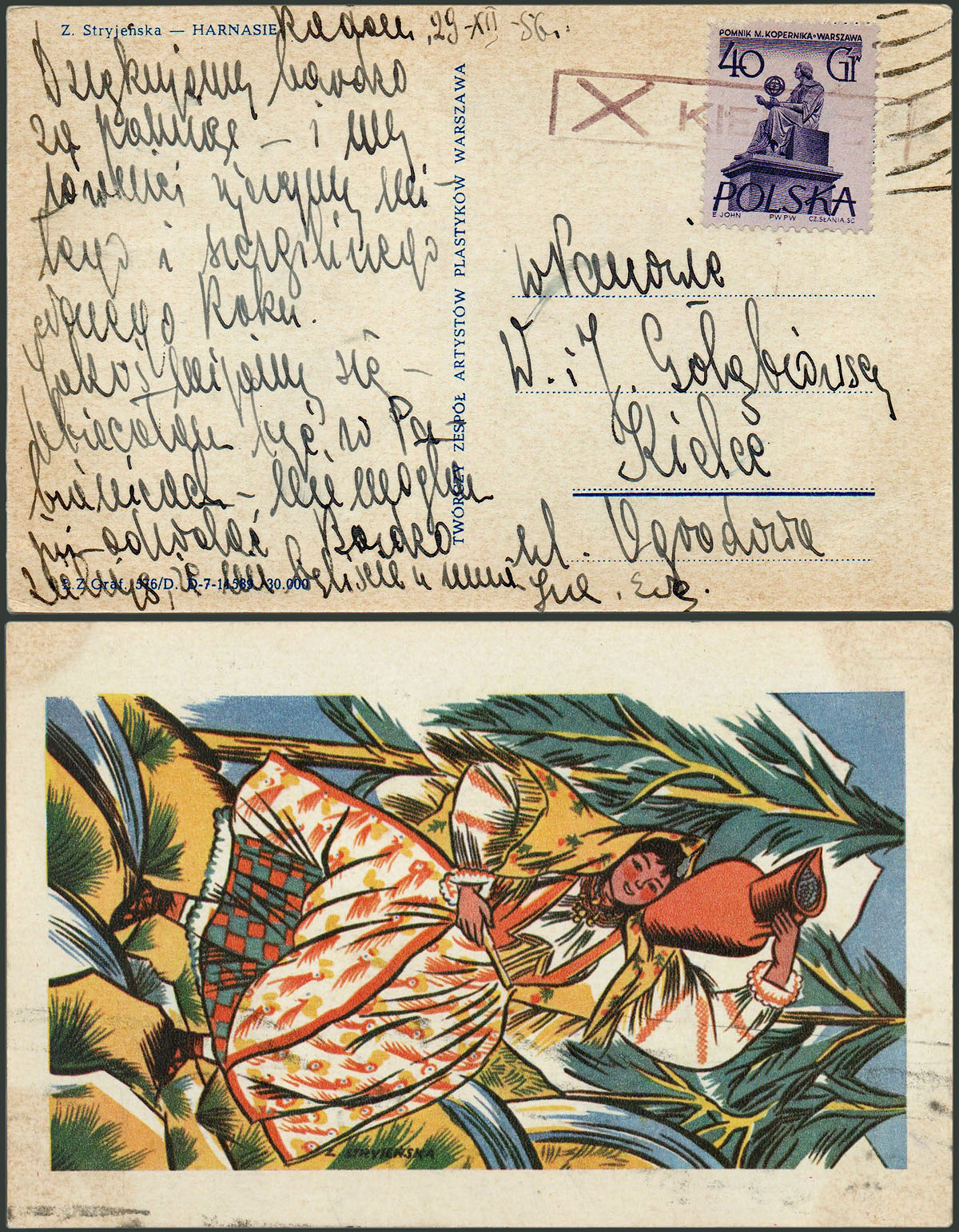 1956 widokówka (Harnasie Z. Stryjeńskiej) wysłana miejscowo z Radomia do Kielc, znaczek nie został skasowany w Radomiu przy nadaniu, skasowano go przed wydaniem adresatowi stemplem zastępczym " X KIELCE". | Fi.765 |