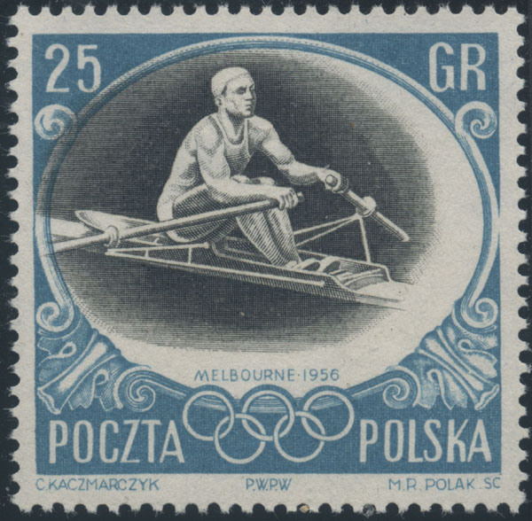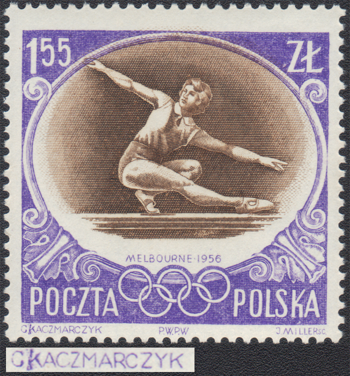 1956 XVI Igrzyska Olimpijskie w Melbourne, znaczek za 1,55 zł z powtarzalnym błędem "zniekształcona pionowa kreska pierwszej litery K w KACZMARCZYK"; bardzo dobry stan zachowania; gwarancja. | Fi.848 B Mi. Mi.989 |