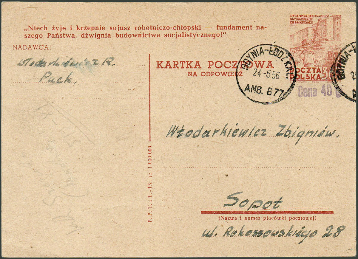 1956 kartka do Sopotu nadana w ambulansie kolejowym na trasie Gdynia – Łódź Kaliska nr 677. | Fi.Cp132B |