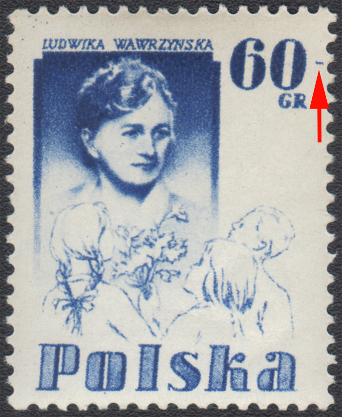 1956 Ludwika Wawrzyńska, znaczek za 60 gr z powtarzalnym błędem "kreseczka na prawo od cyfry 0 nominału"; bardzo dobry stan zachowania; gwarancja. | Fi.836 B Mi.980 |