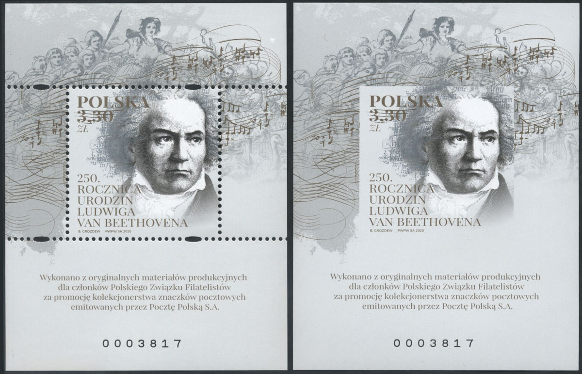 2020 250. rocznica urodzin Ludwika van Beethovena, nowodruki w formie bloków wykonane z oryginalnych materiałów produkcyjnych dla członków PZF. | Fi.5118ND A, B |