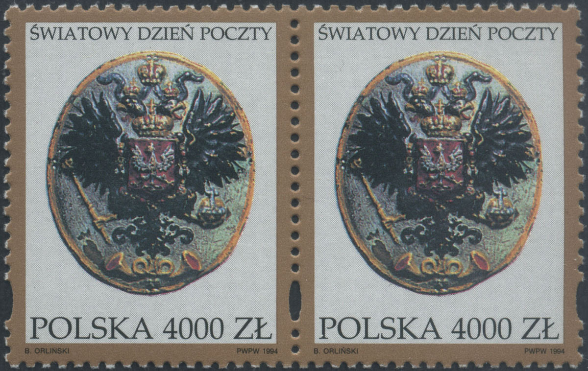 1994 Światowy Dzień Poczty, prawy znaczek z błędem "uszkodzone P w POLSKA", gwarancja i opis Walocha. | Fi.3364B1 Mi.3509 |