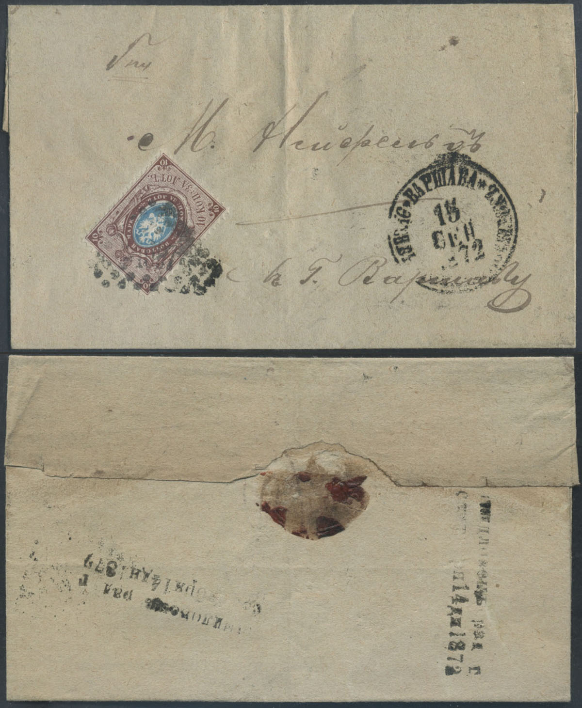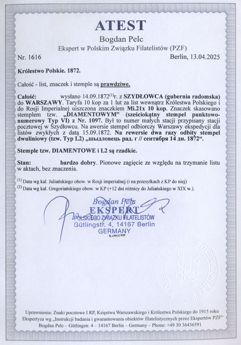 1872 list składany z Szydłowca do Warszawy, znaczek rosyjski unieważniony rzadkim stemplem "diamentowym" z numerem 1097, na awersie stempel odbiorczy Warszawy, na odwrocie rzadki stempel dwuwierszowy ekspedycji na dworcu w Szydłowcu, fotoatest Pelc. | Mi.21x |
