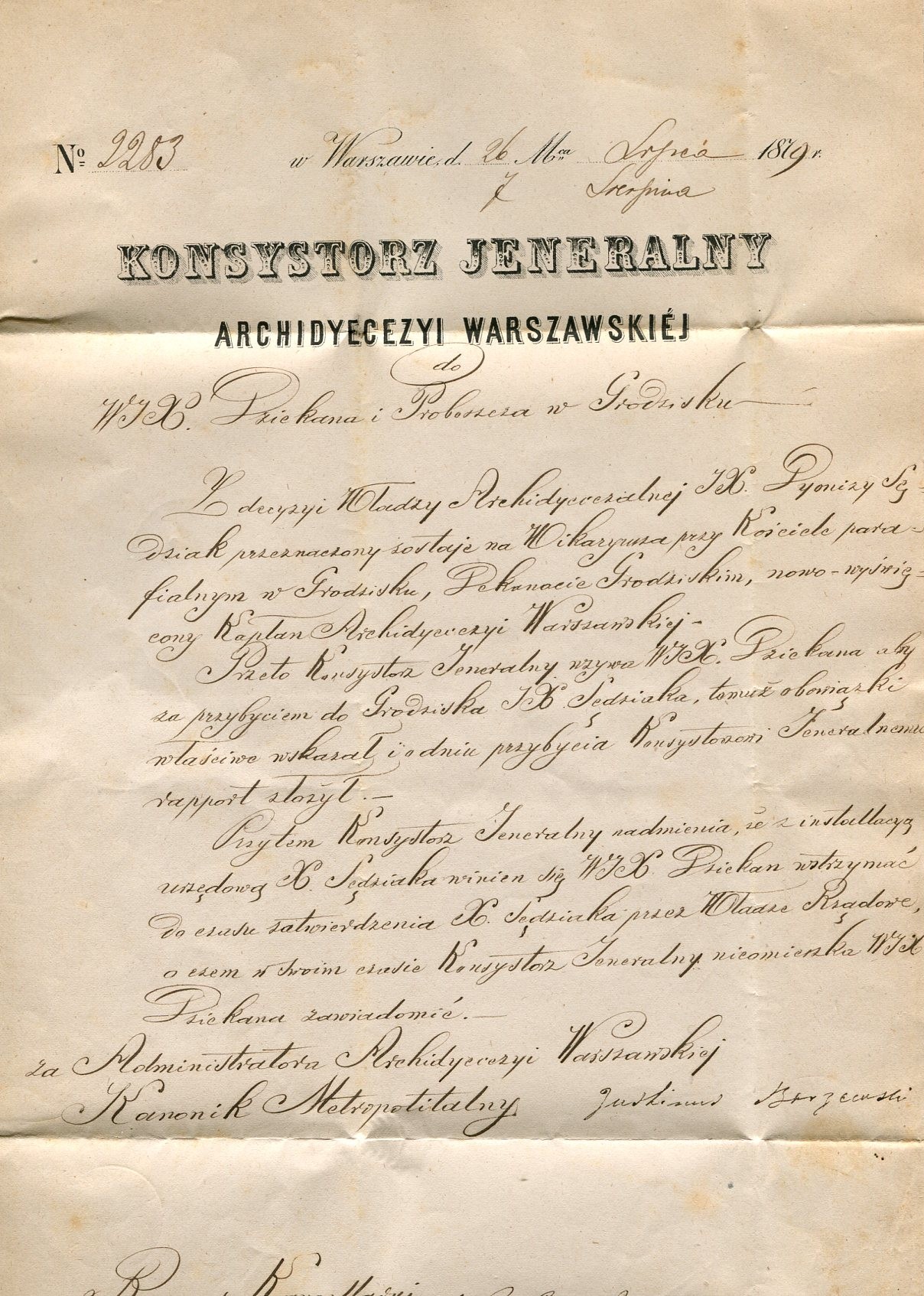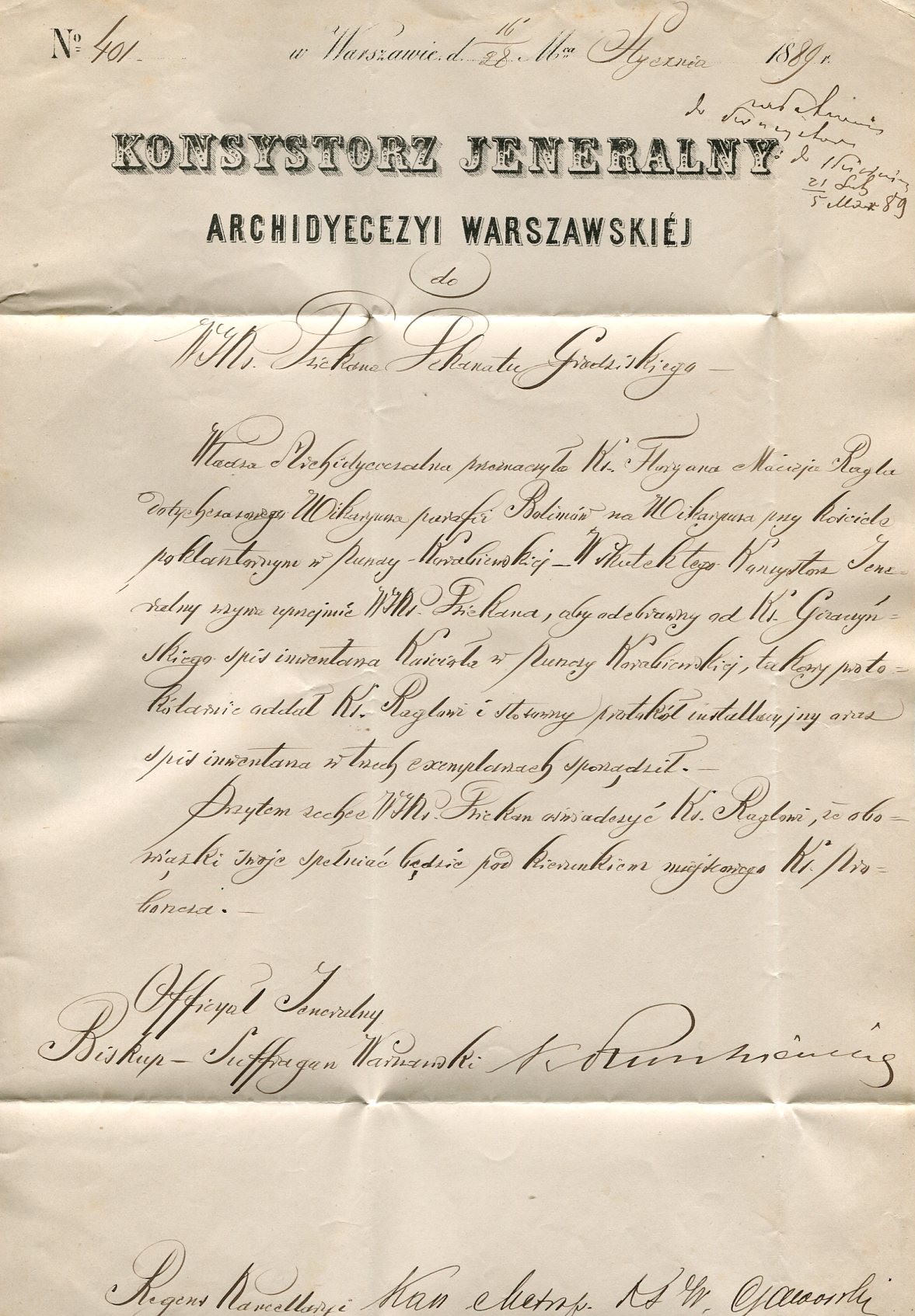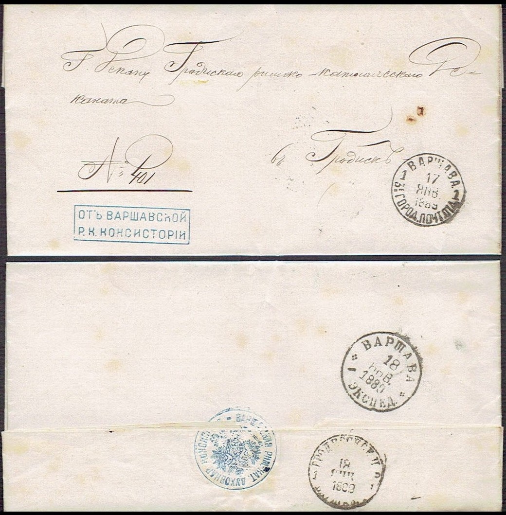 1889 Warszawa, kompletny list składany wysłany z Warszawy do Grodziska, stempelek "ot Warszawskoj P.K. Konsistori" oznaczający, że list jest zwolniony z opłaty pocztowej, pismo na papierze firmowym "Konsystorz Generalny Archidyecezyyi Warszawskiey", z tyłu obwoluty odciśnięta pieczęć. | |