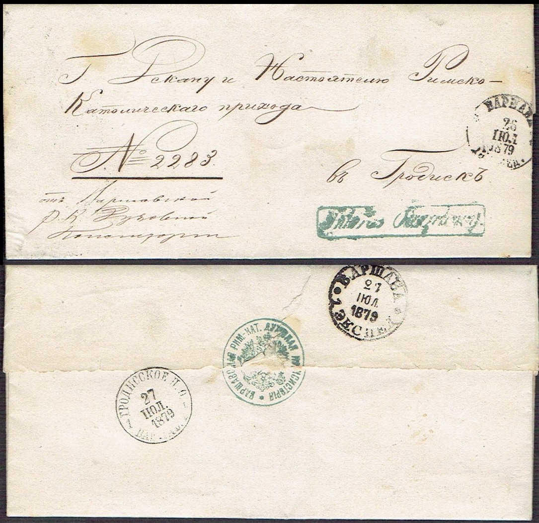 1879 Warszawa, kompletny list składany wysłany z Warszawy do Grodziska, stempelek "Interes Rządowy" oznaczający, że list jest zwolniony z opłaty pocztowej (bardzo późne użycie tego stempelka), pismo na papierze firmowym "Konsystorz Generalny Archidyecezyyi Warszawskiey", z tyłu obwoluty ładnie odciśnięta pieczęć. | |