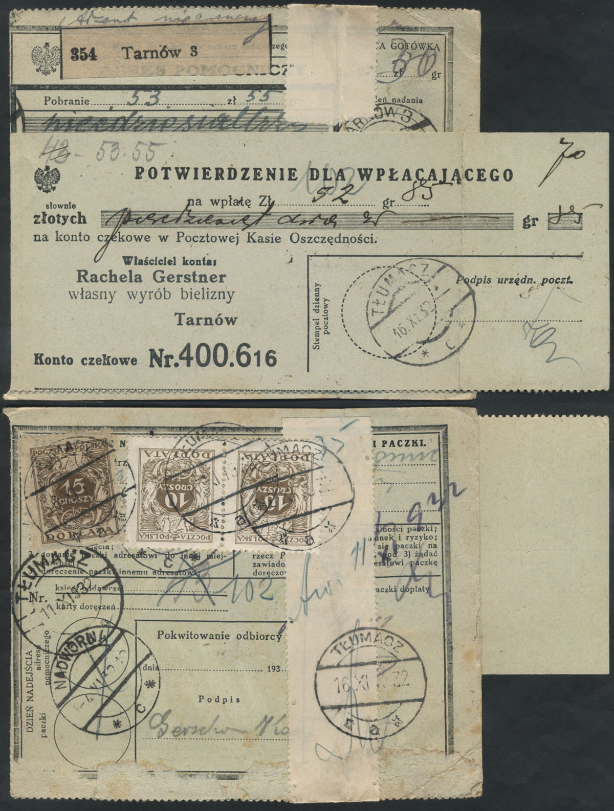 1932 adres pomocniczy paczki z Tarnowa do Tłumacza, na odwrocie potwierdzenia dla wpłacającego dodatkowe znaczki dopłaty. | Fi.D69,D70, D75 |
