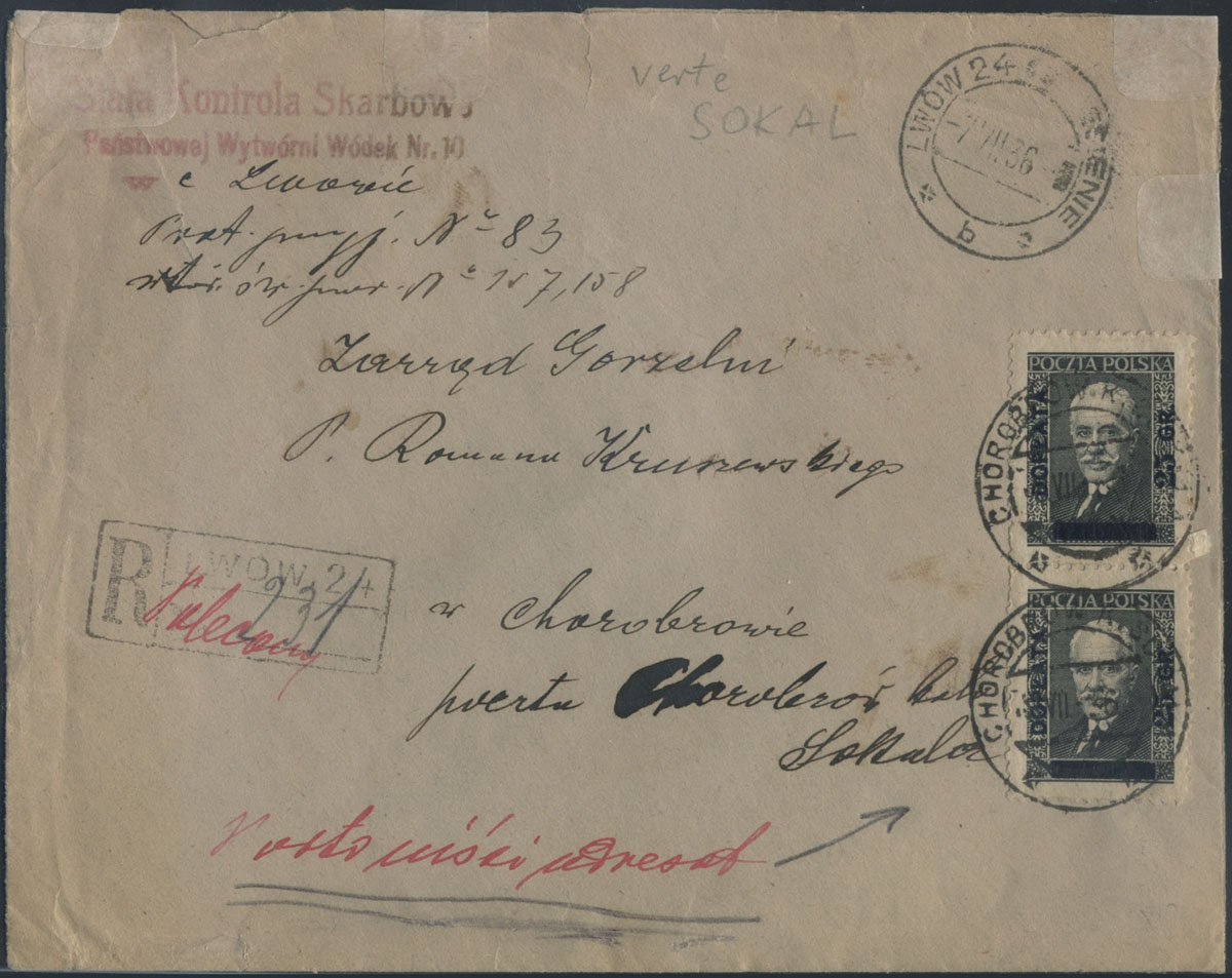 1936 list polecony z Wytwórni Wódek we Lwowie do Chrobrowa, przesyłka na koszt odbiorcy opłacona znaczkami dopłaty. Stempel nadawczy UP Lwów 24 | Fi.D91 |