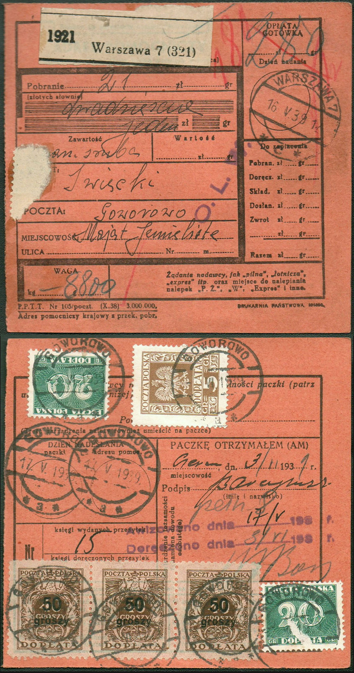 1939 adres pomocniczy do paczki z pobraniem z Warszawy do Goworowa, opłaty doręczeniowe znaczkami dopłaty trzech wydań. | Fi.D80a, D87, D95 |