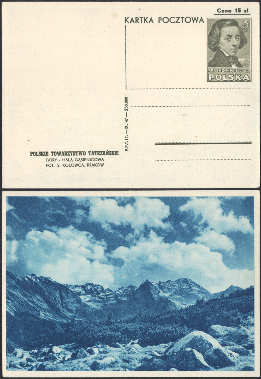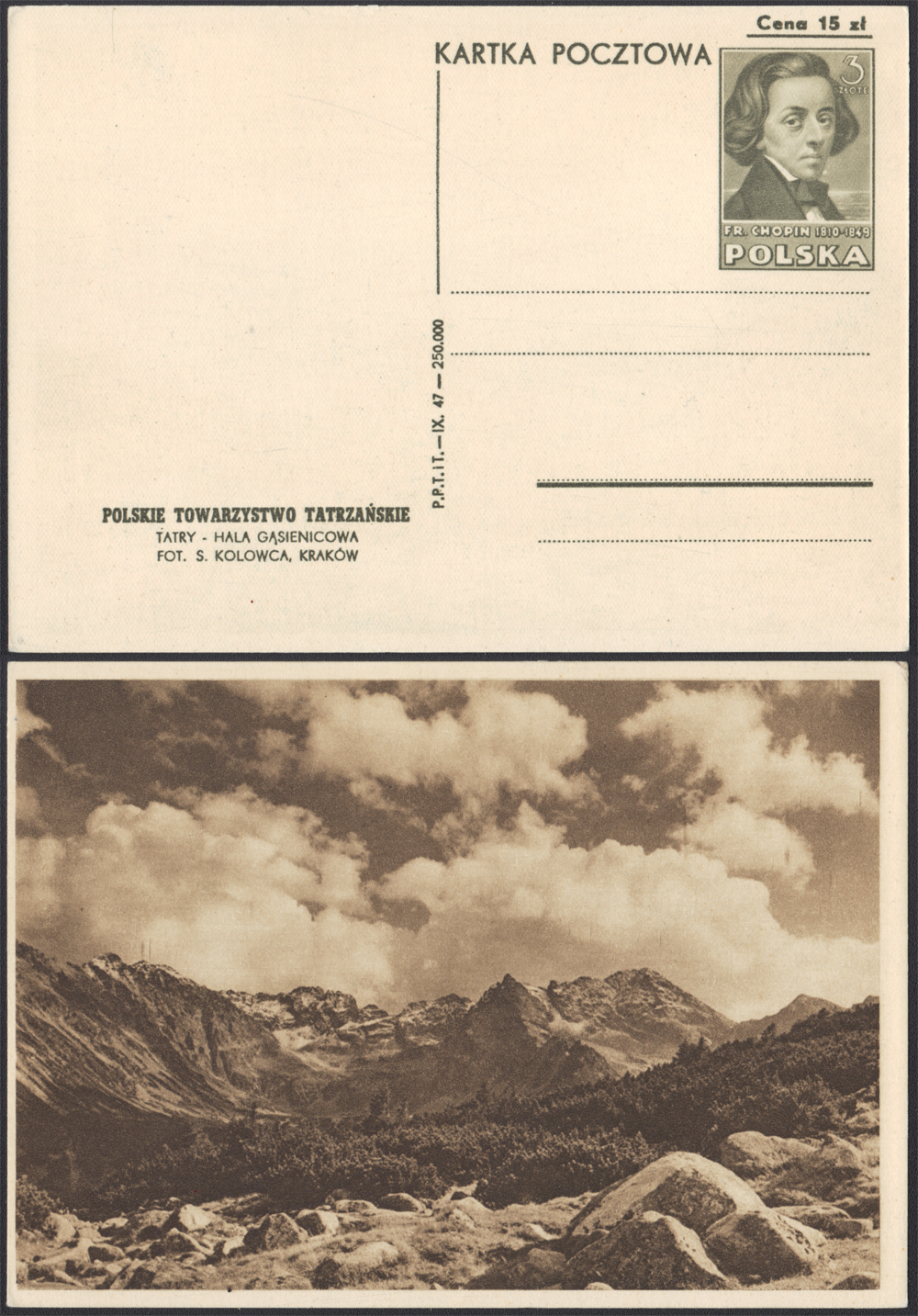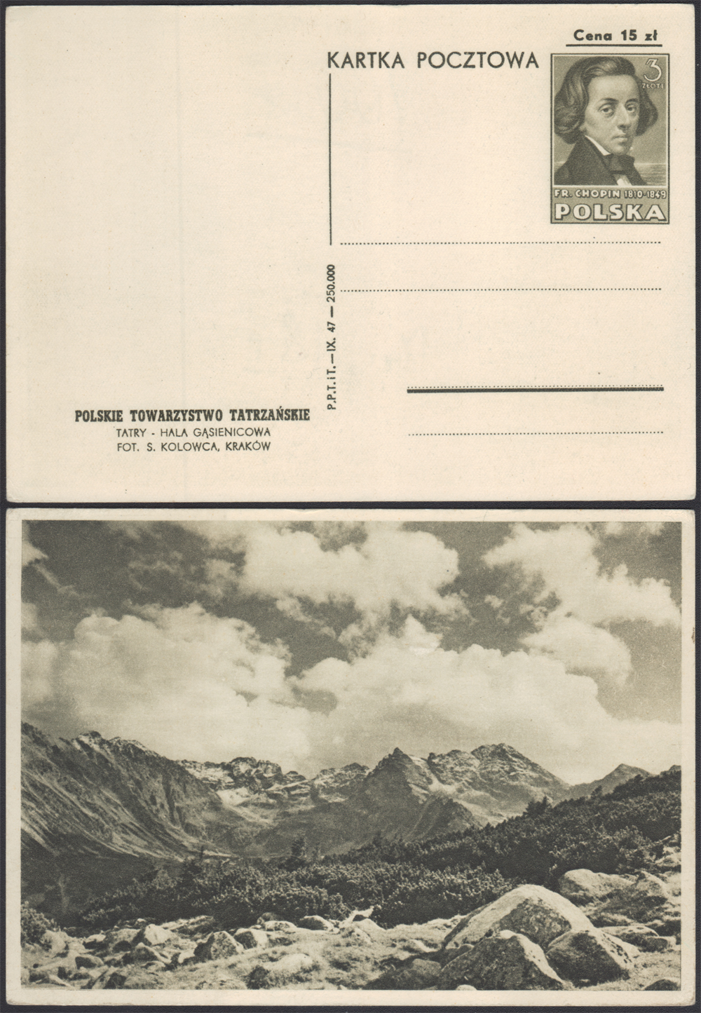 1947 karta pocztowa skasowana ze znakiem opłaty Fryderyk Chopin, z ilustracją TATRY - HALA GĄSIENICOWA, w kolorze oliwkowobrązowym; dobry stan zachowania (Fi.60.-). | Fi.Cp101c |