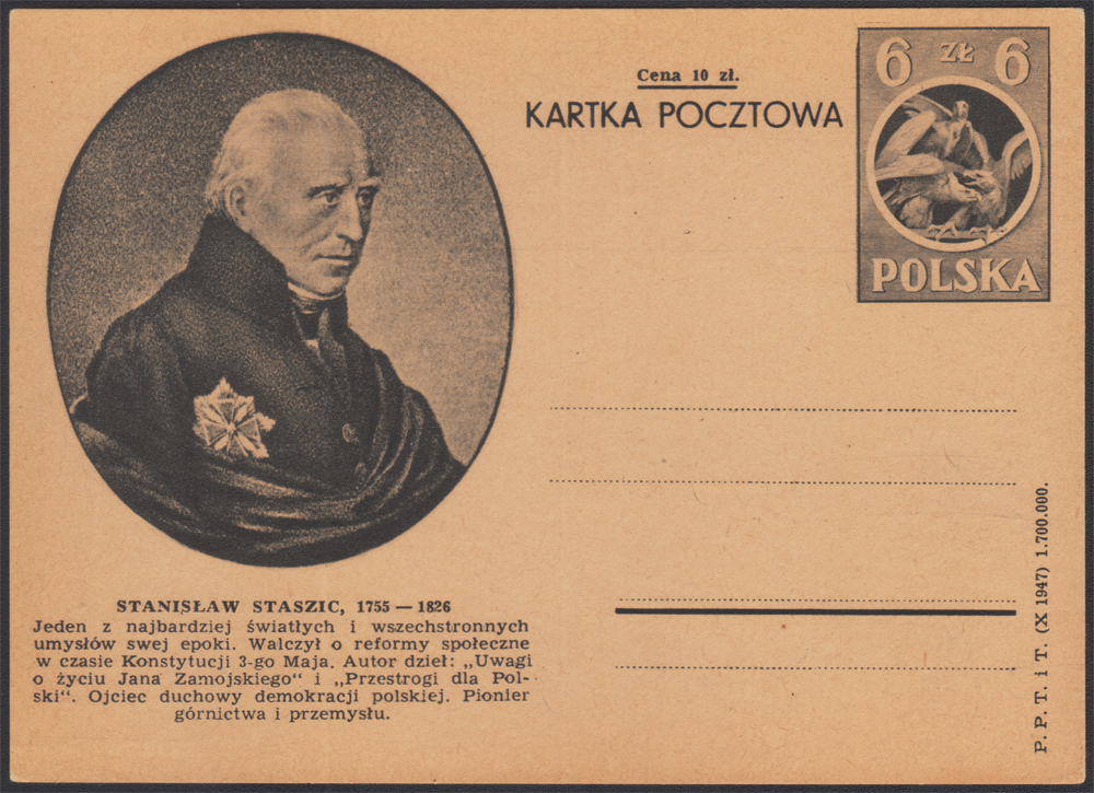 1948 Trzy walczące orły, karta z ilustracją 18 - Stanisław Staszic, bardzo dobry stan zachowania. | Fi.Cp106 |