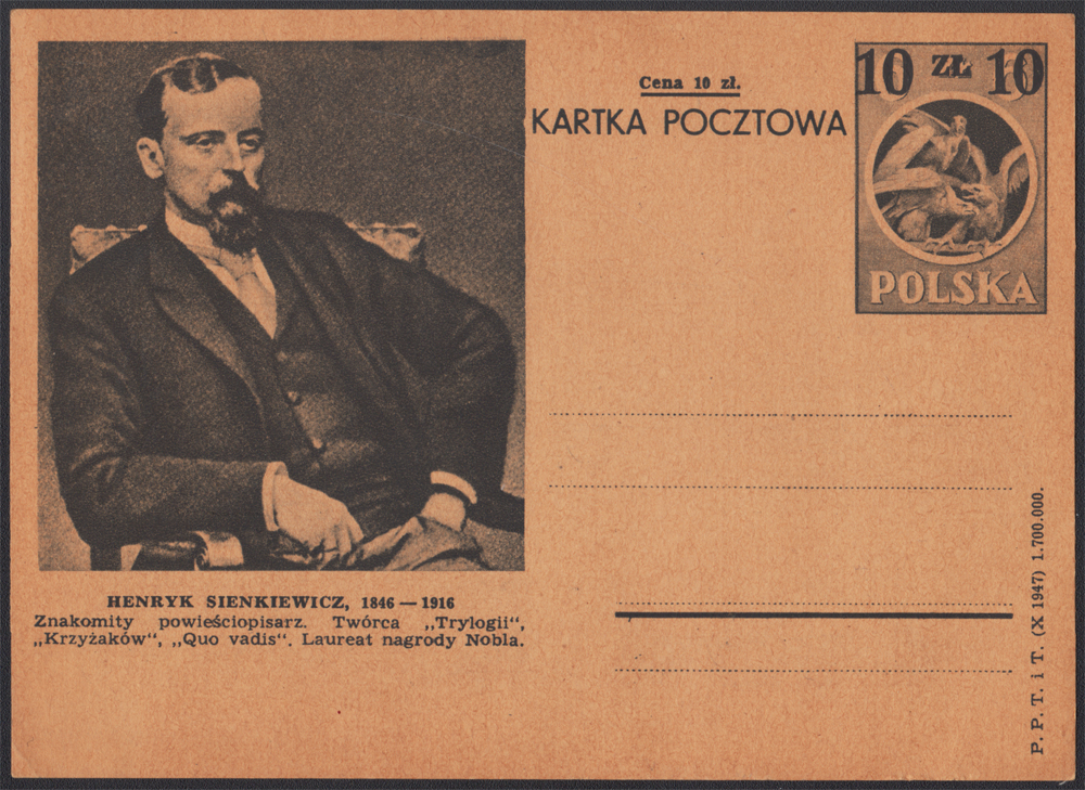 1949 wydanie prowizoryczne, karta 106 z ilustracją 17 - Henryk Sienkiewicz z nadrukiem typu 15; bardzo dobry stan zachowania. | Fi.Cp121 |