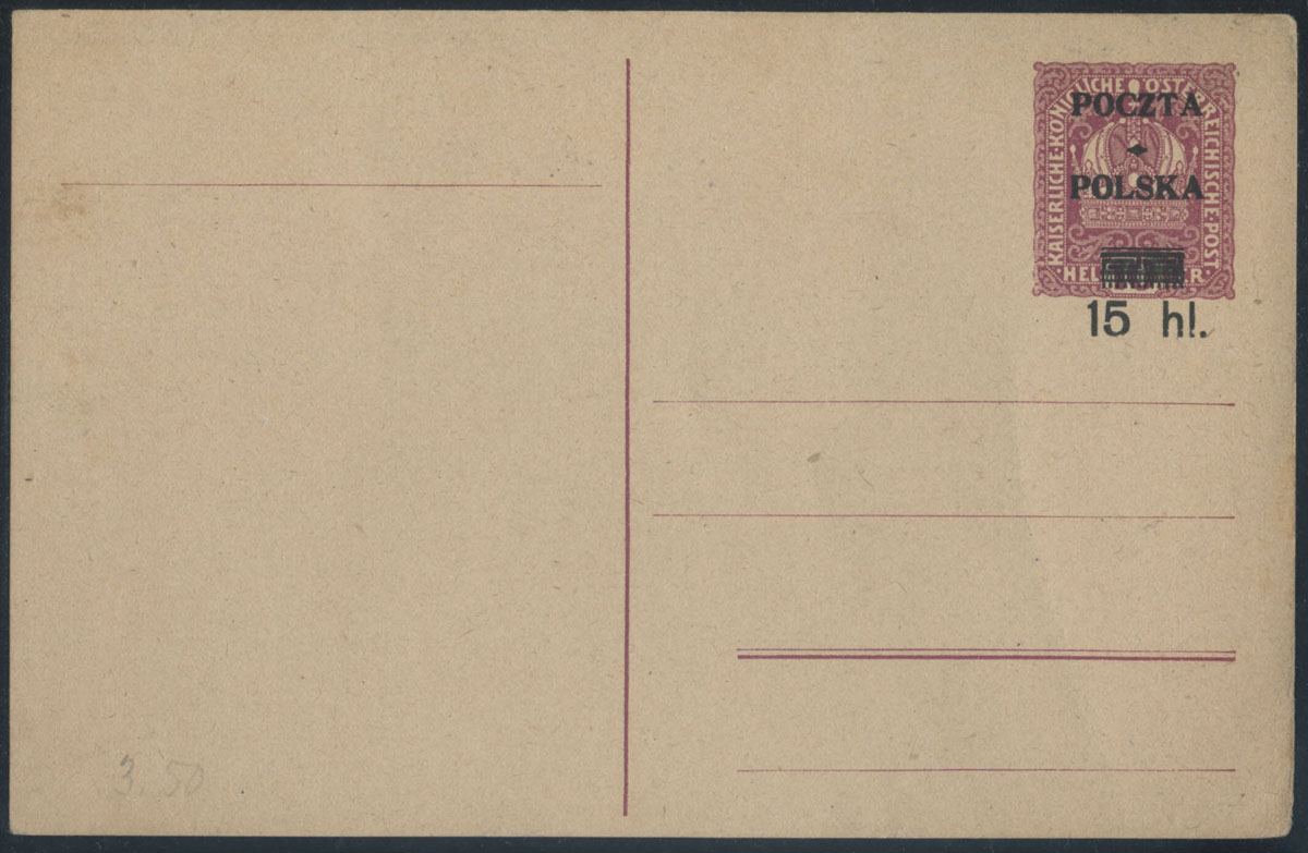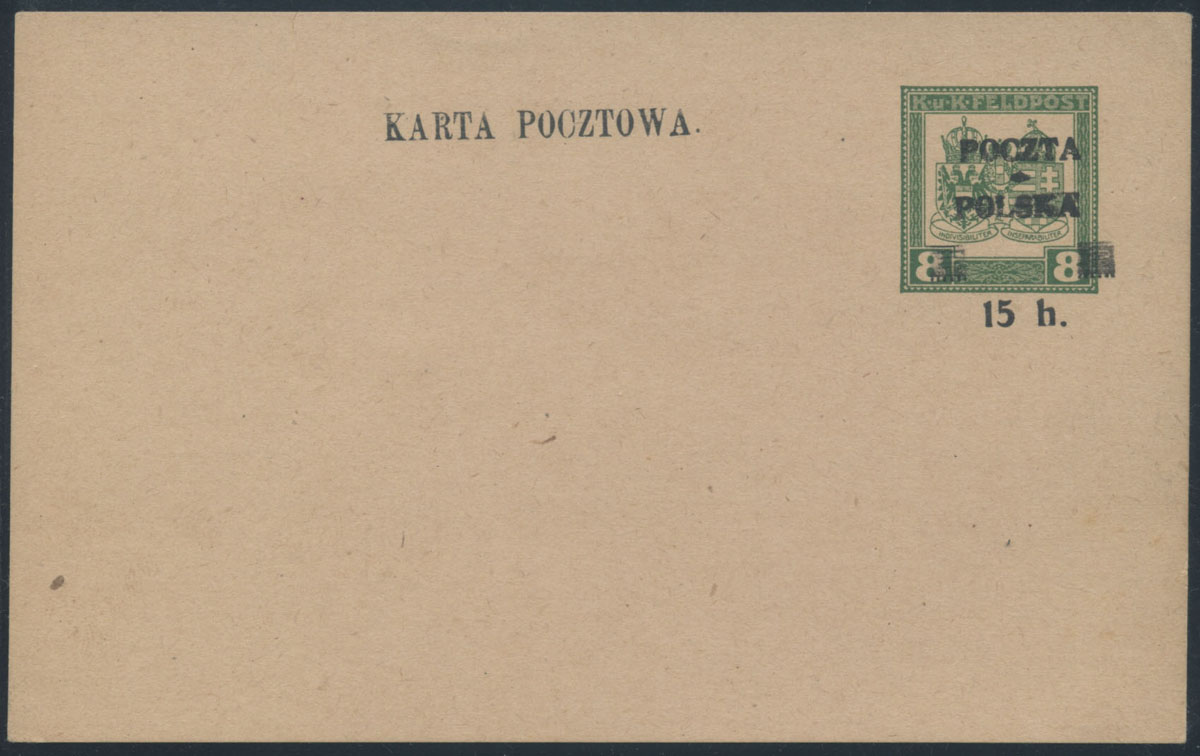1919 wydanie krakowskie - USZKODZONY NAPIS KARTA POCZTOWA, całostka na kartonie szarym, z nietypowo bardzo słabo odbitym nadrukiem typu 137 "POCZTA POLSKA / 15 h.", dodatkowo uszkodzony napis "KARTA POCZTOWA" - większość liter uszkodzona z prawej strony; karta ostemplowana dwoma pieczątkami firmowymi: na froncie "Towarzystwo dla Przemysłu i handlu drzewnego "LAS"w CIESZYNIE", na odwrocie: "Józef Kosowski hurtowny handel drzewem w Pierścu p.Skoczów (Śląsk)"; zachowana w ładnym stanie, gwarancja. | Fi.Cp19Iy |