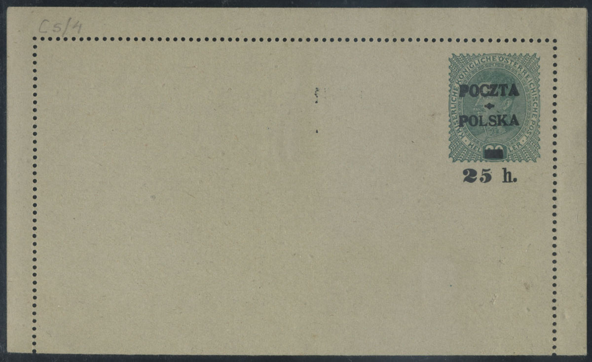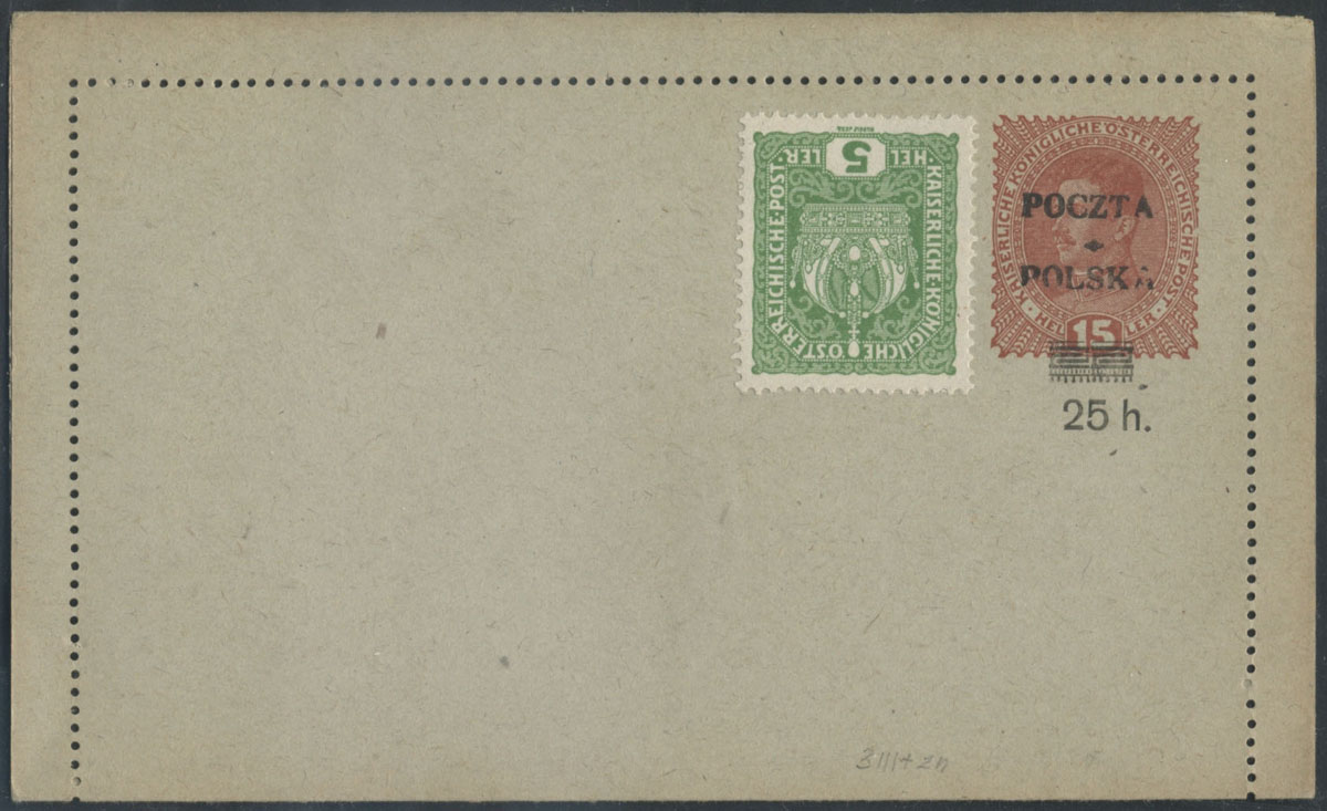 1919 wydanie krakowskie, sekretnik z nadrukiem częściowo na doklejonym znaczku uzupełniającym brakującą opłatę po podwyższeniu austriackiej taryfy pocztowej. | Fi.Cs3II |