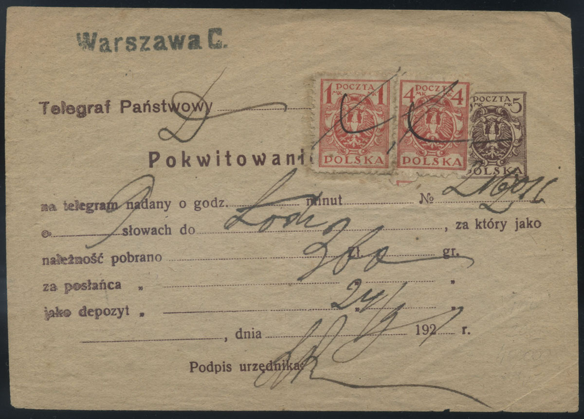 1920 pokwitowanie telegraficzne ze znakiem opłaty - 50 fen "mały orzeł", dofrankowane na odwrocie w związku ze wzrostem taryfy pocztowej unieważnione niespotykanym kasownikiem - dwie równoległe poziome linie, stempelek urzędu telegraficznego "Warszawa C", na froncie w lewym górnym rogu odciśnięta duża cyfra "1", słabszy stan zachowania. | Fi.Ct8 |