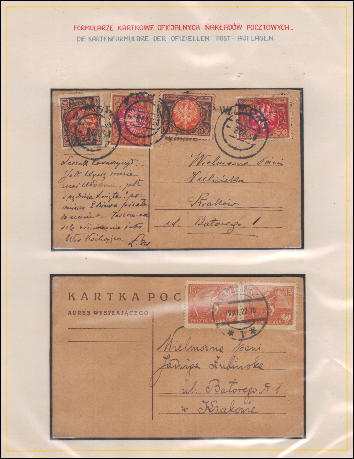 1922-25 w tych latach w związku z częstymi zmianami taryfy pocztowej, Zarząd Poczty wydawał oficjalne nakłady kart pocztowych bez wydrukowanego znaku opłaty; ofrankowany formularz wysłany 25.IV.23 ze Lwowa do Krakowa; bardzo dobry stan zachowania; ofrankowany formularz wysłany 19.XI.22 ze Lwowa do Warszawy; dobry stan zachowania; na karcie albumowej ze zbioru Janusza Adamczyka. | Fi.CfpI |