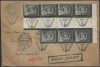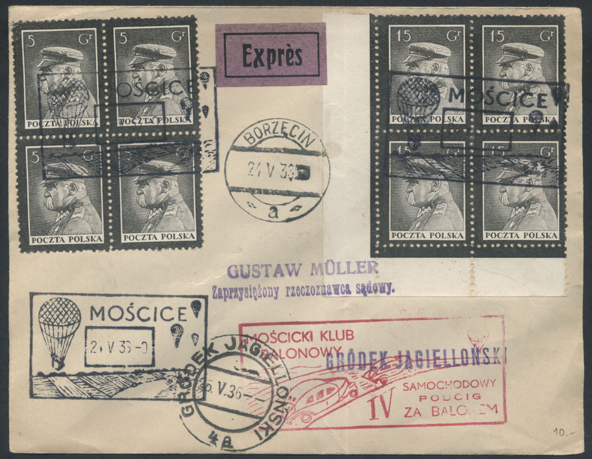 1936 IV Samochodowy Pościg za Balonem Wolnym w Mościcach, list ekspresowy do Ozorkowa przesłany balonem 24.V balonem, znaczki unieważnione stemplem okolicznościowym w rzadszym kolorze czerwonym, dodatkowy stempel standardowo też w kolorze czerwonym, datownik miejsca lądowania Borzęcin, a na odwrocie kasownik odbiorczy; dość rzadki walor, niewiele sztuk miało stemple okolicznościowe odciśnięte w kolorze czerwonym; doskonały stan zachowania. | Fi.13b |