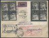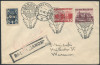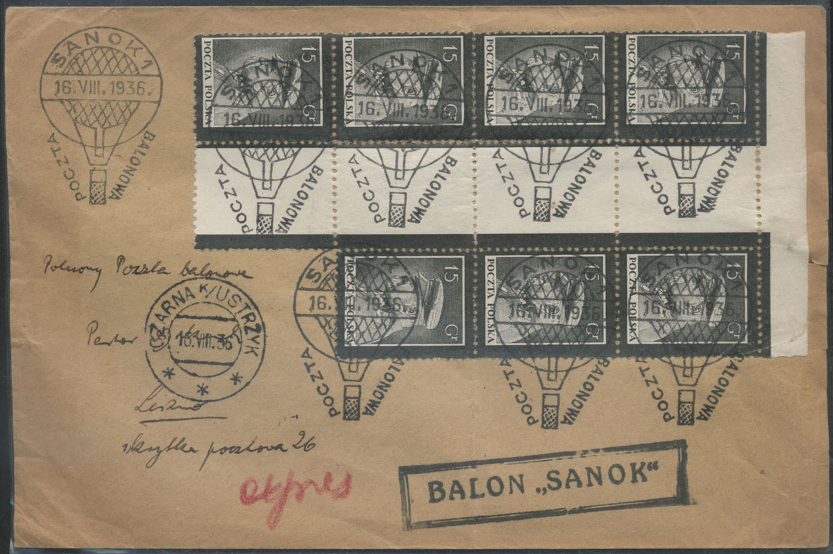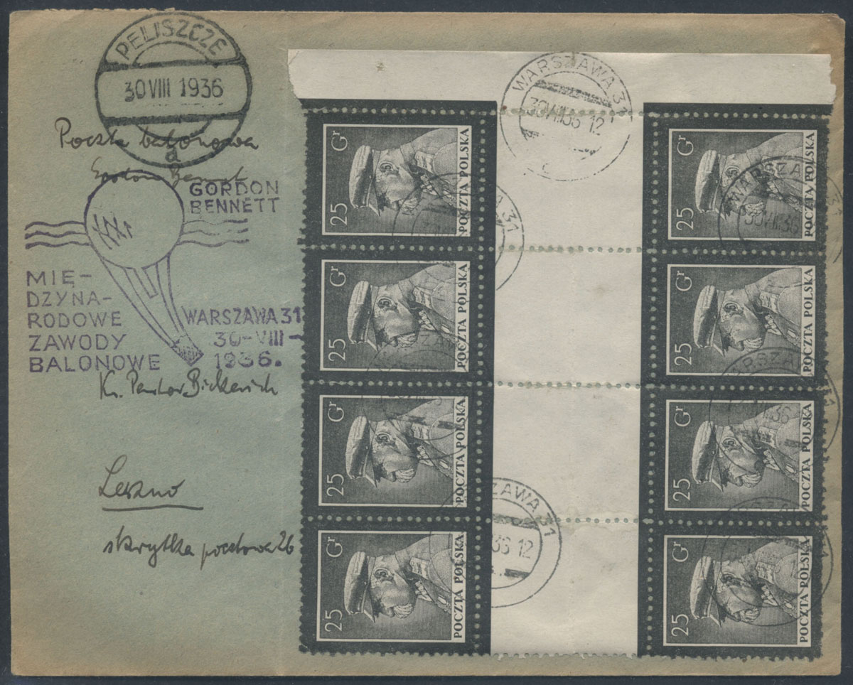 1936 Zawody balonowe o puchar Gordon-Bennetta, list ofrankowany obydwoma znaczkami, przesłany 30.VIII pocztą balonową z Warszawy do Wolnego Miasta Gdańska; dodatkowo na odwrocie nalepka propagująca XVI Międzynarodowe Targi Wschodnie we Lwowie; dekoracyjna całość. | Fi.292-93 Mi.313-14 |