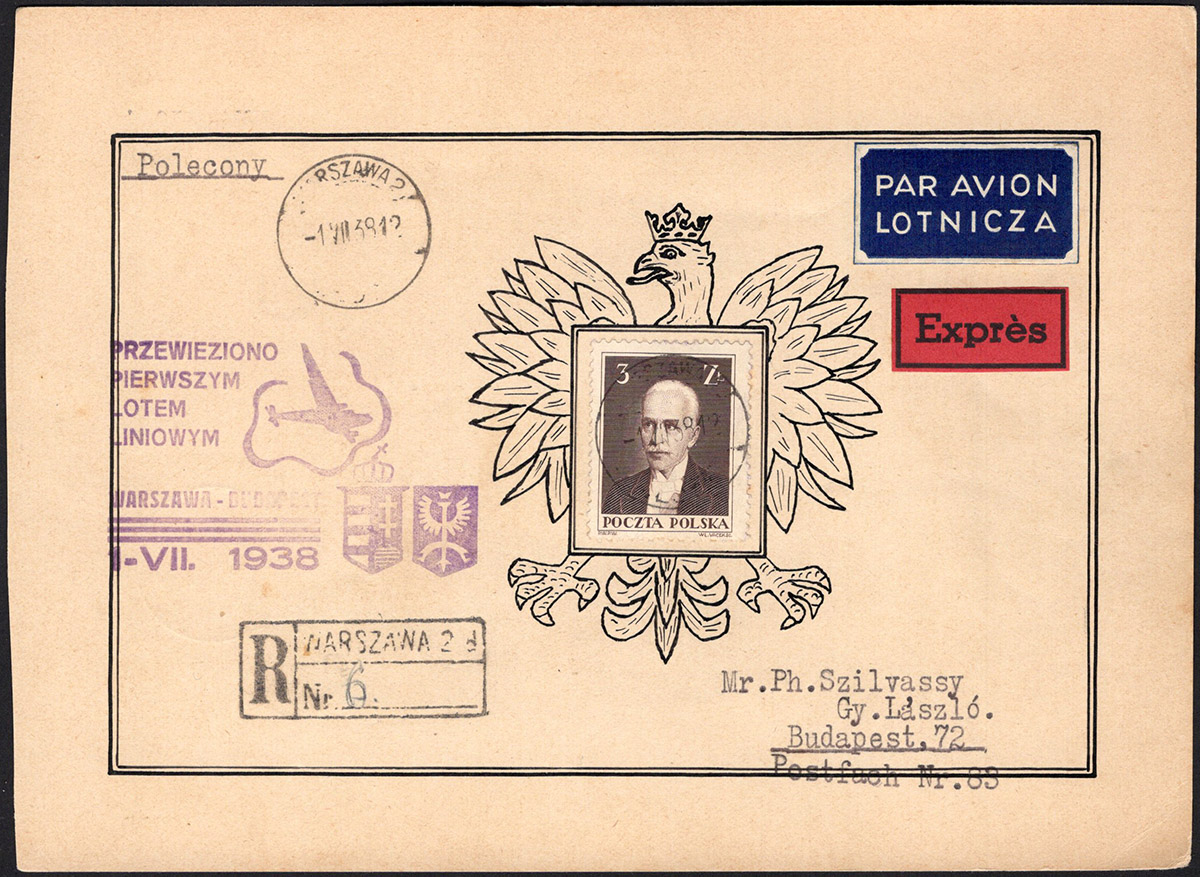 1938 I lot Warszawa - Budapeszt, list polecony z Warszawy do Budapesztu na specjalnie przygotowanej ozdobnej kopercie ze stemplem "PRZEWIEZIONO PIERWSZYM LOTEM LINIOWYM WARSZAWA - BUDAPESZT 1-VII.1938", na odwrocie stempel odbiorczy. | Fi.137a |