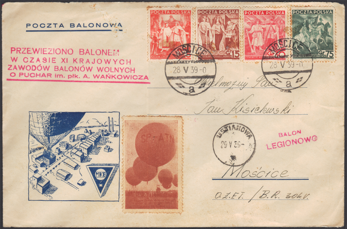 1939 XI Krajowe Zawody Balonowe o Puchar Przechodni im.A.Wańkowicza w Mościcach, balon "Legionowo" czy "Poznań"? list przygotowany do przewiezienia balonem, ilustrowana, dekoracyjna koperta z dodatkową nalepką balonową, ze stemplem okolicznościowym i stempelkiem "BALON LEGIONOWO" oraz datownikiem odbiorczym "USTJANOWA 29.V.39", tymczasem balon "Legionowo" zakończył zawody w Ustrzykach Dolnych i wszystkie znane dotąd przesyłki, przewiezione na jego pokładzie, opatrzone są datownikiem odbiorczym "USTRZYKI DOLNE 29.V.39", za to balon "Poznań" lądował właśnie w Ustjanowej, najpewniej przesyłkę, która miała być przesłana "Legionowem", przed lotem umieszczono omyłkowo w worku z pocztą dla "Poznania", co racjonalnie wyjaśnia sposób w jaki powstał, nieznany dotąd, niepowtarzalny walor; dobry stan zachowania. | Fi.29 |