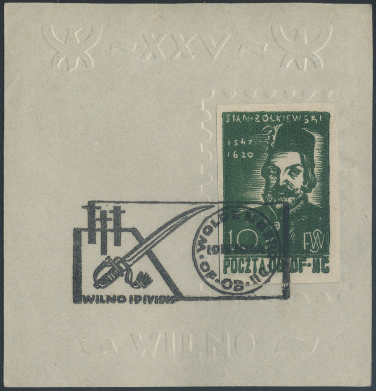 1944 znaczek ostemplowany kasownikiem okolicznościowym "WILNO" na rzadkiej karcie z suchym tłoczeniem z okazji XXV rocznicy wyzwolenia Wilna, gwarancja Walocha. | Fi.25 |