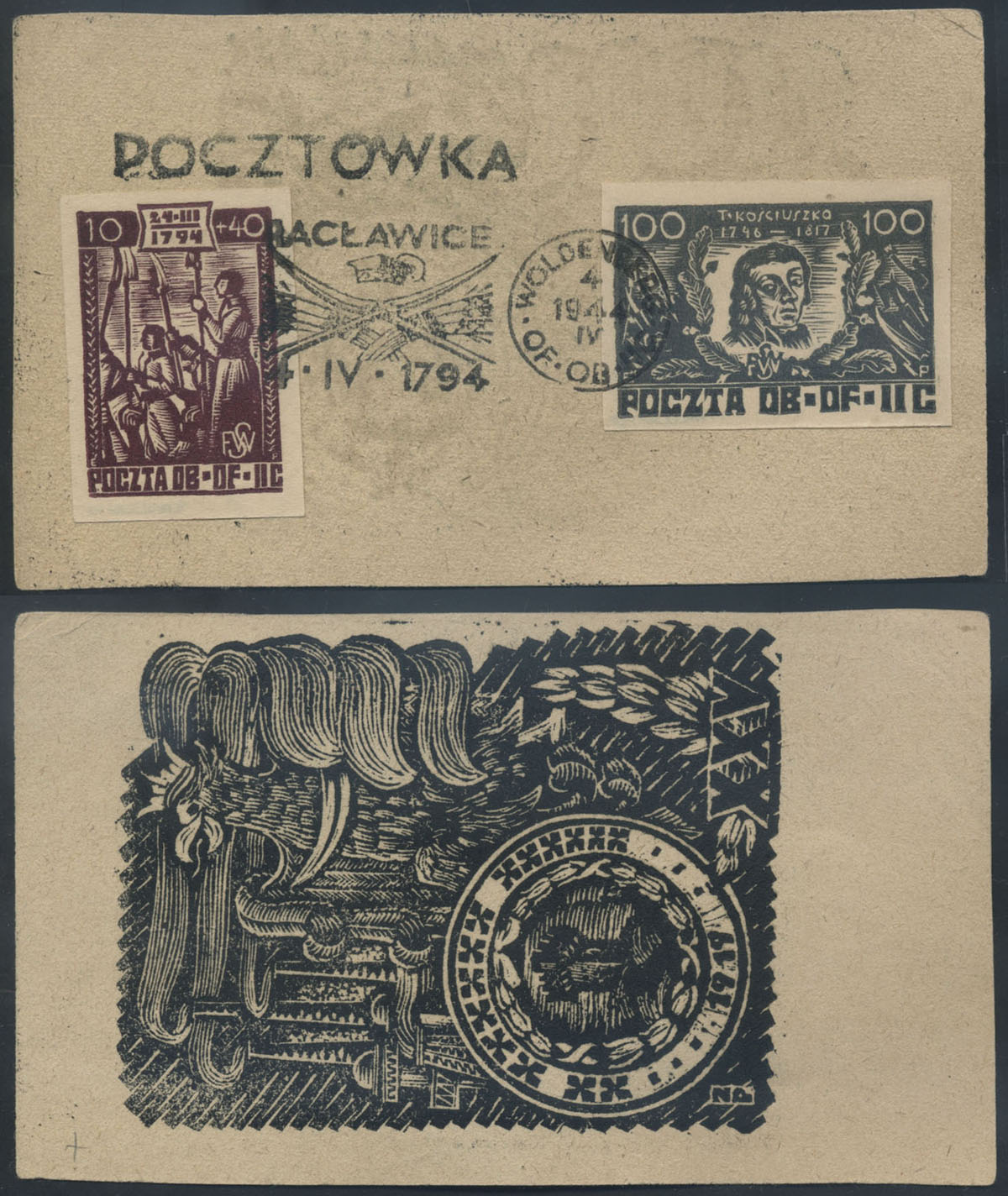 1944 150. rocznica Powstania Kościuszkowskiego - znaczek za 10 + 40 f i pomarańczowy znaczek za 15 f z hetmanem Janem Karolem Chodkiewiczem na karcie ozdobionej drzeworytem przedstawiającym Górę Trzykrzyską w Wilnie skasowane 19.IV stemplem okolicznościowym "WILNO"; na odwrocie napis POCZTÓWKA; dobry stan zachowania; gwarancja Walocha. | Fi.27, 37 |