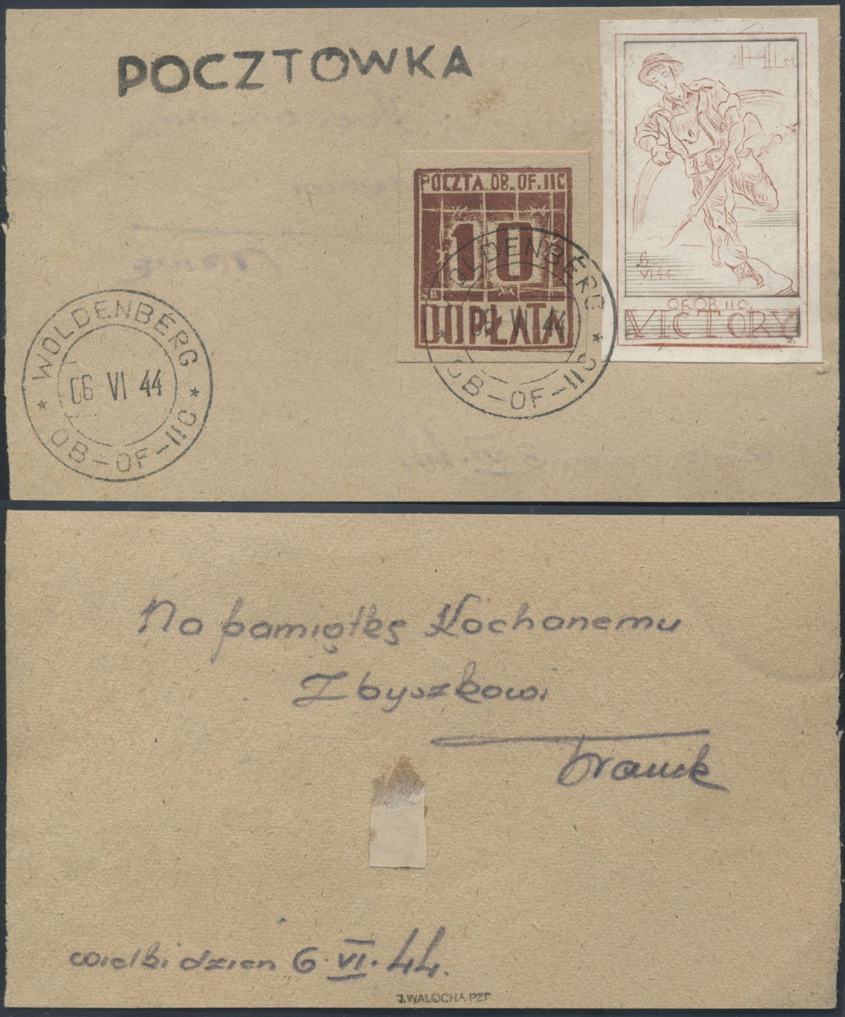 1944 VICTORY - nalepka propagandowa o nominale upamiętniają dzień 6.06.44 - inwazji Wojsk Sprzymierzonych w Normandii, użyta na kartce z życzeniami na odwrocie, przesyłka miała tajny charakter, znaczek bez mocy obiegowej stąd opłata przez odbiorcę znaczkiem dopłaty, nalepka użyta na korespondencji bardzo rzadka, gwarancja Walocha. | Fi.D4 |