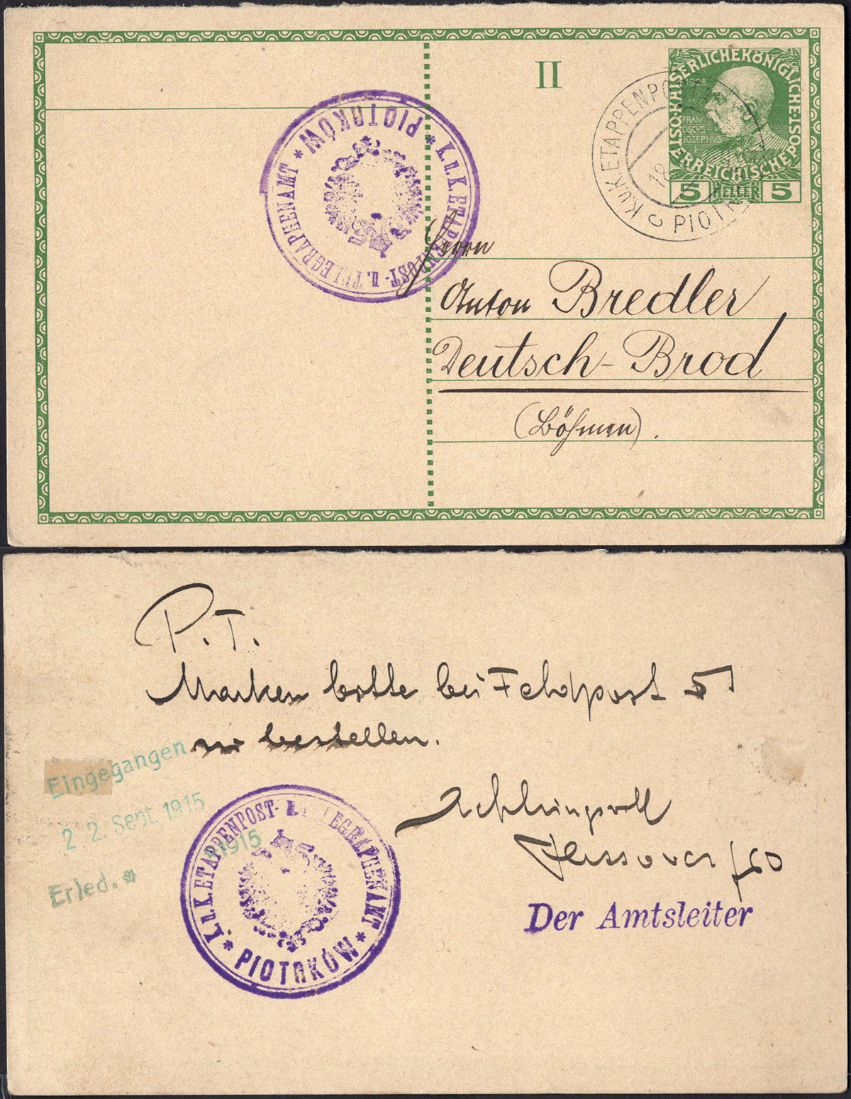 1915 kartka nadana z poczty etapowej w Piotrkowie, stempel formacyjny poczty etapowej w Piotrkowie. | |